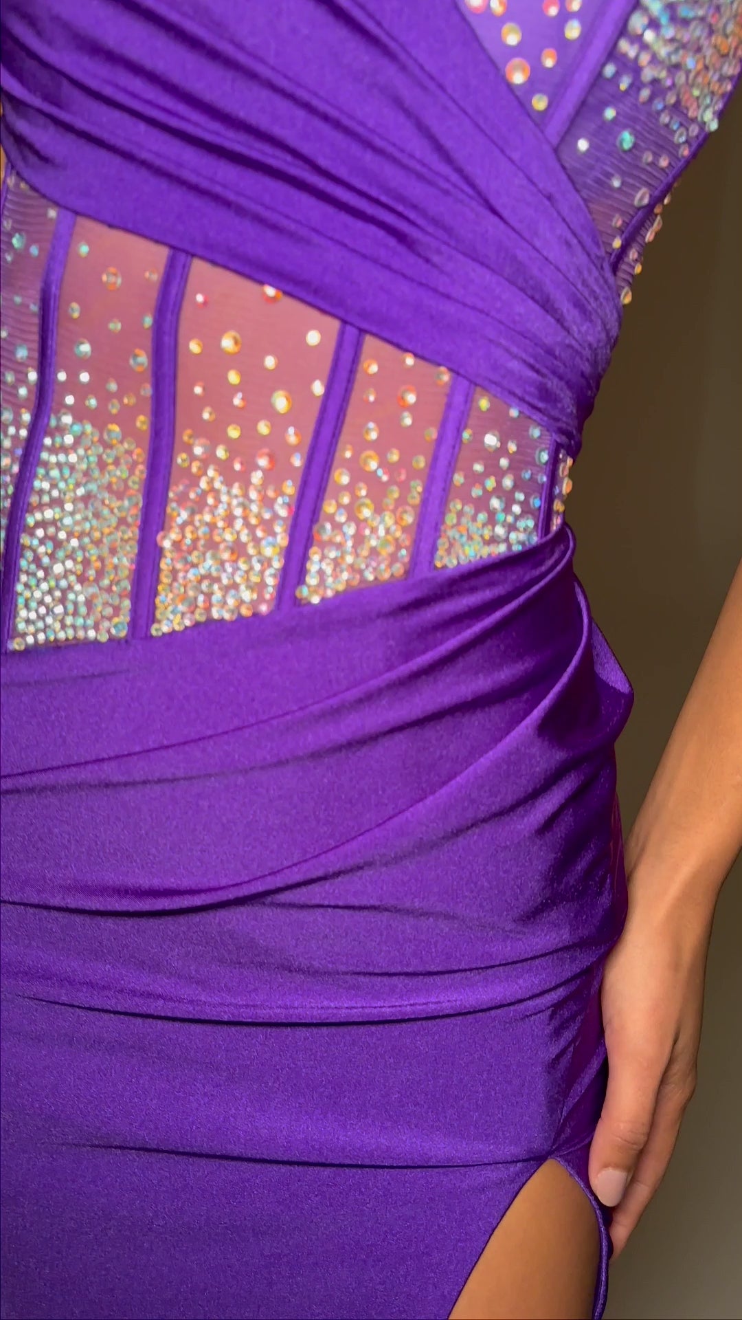 The Ashley Lauren 11617 Evening Gown is crafted from sheer fabric with a one shoulder design adorned with delicate crystal embroidery. The fitted silhouette features a corset bodice with a maxi slit and long train with a voluminous skirt. Perfect for prom, pageants, and formal events. Elegance with a twist! This one shoulder jersey gown features a stunning beaded corset bustier for an added touch of glam.