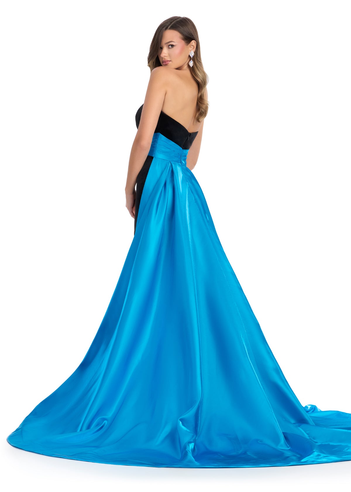 Elevate your formal wear with the Ashley Lauren 11857 Long Fitted Velvet Pageant Dress. Crafted from luxurious velvet, this gown is tailored to accentuate your figure. The elegant satin overskirt adds a touch of sophistication, making it perfect for any formal occasion. Make a statement with this stunning evening gown. We are obsessed with this classic strapless velvet dress with a left leg slit. The dress is finished with a gorgeous satin overskirt sinching the waist and oozing elegance.