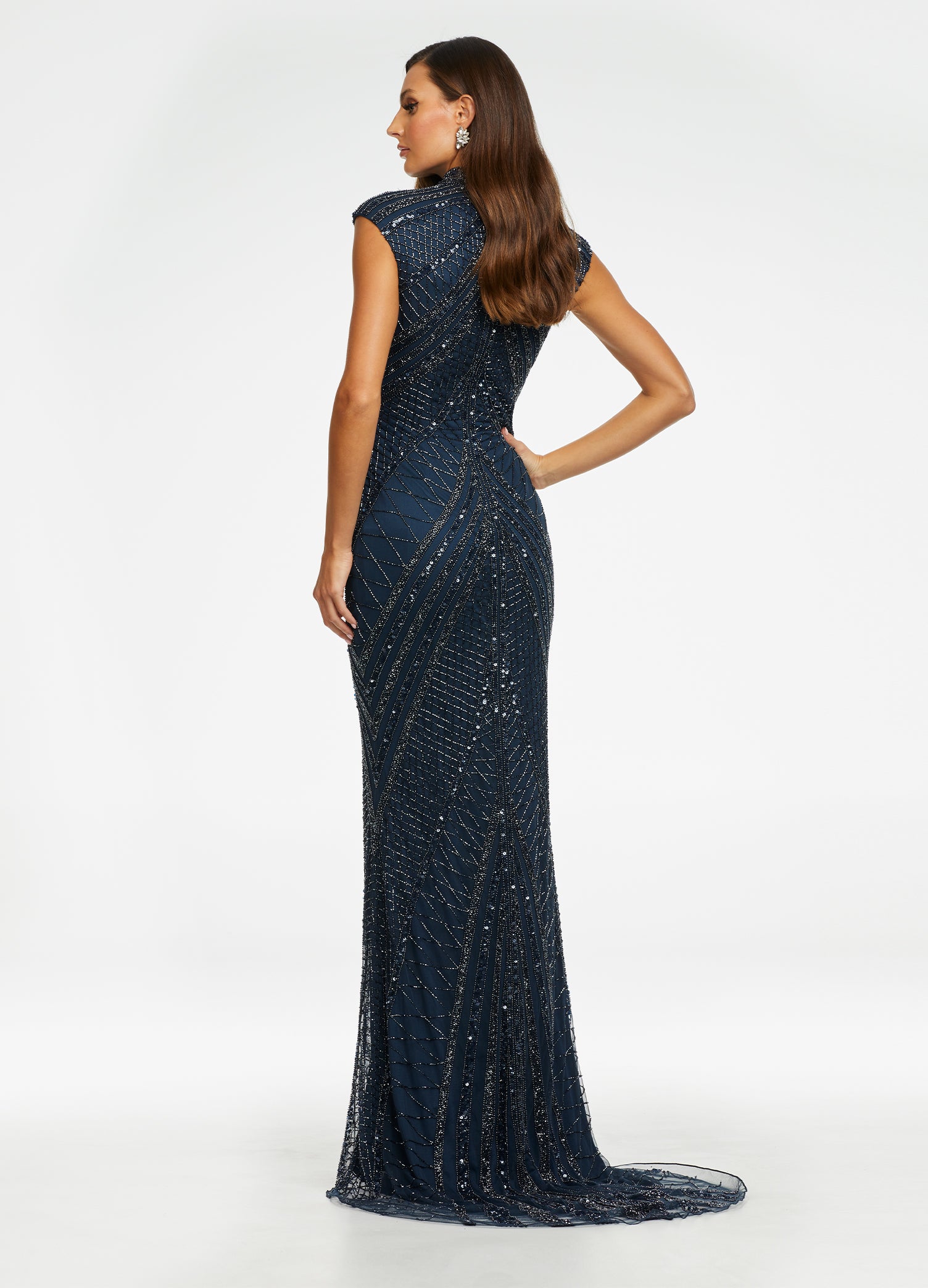 Ashley Lauren 1624 High Neck Beaded Evening Gown With Center Slit Cap Sleeves