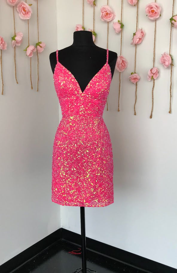 Ashley Lauren 4436 Size 0 Neon Pink Cocktail Dress sequins short homecoming dress