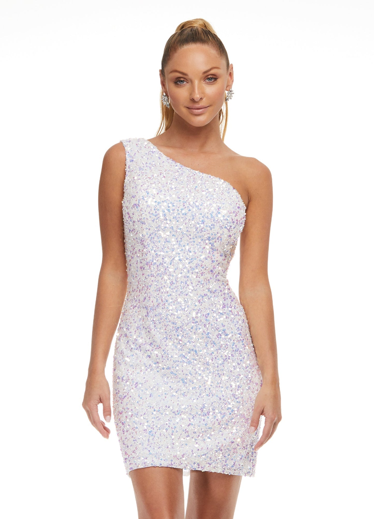 Ashley Lauren 4469 Jade Cocktail Dress. This unique fitted short dress is made sequins. It has an asymmetrical cutout back that has a lace up tie corset. Look marvelous in this short reception dress, pageant or homecoming dress.