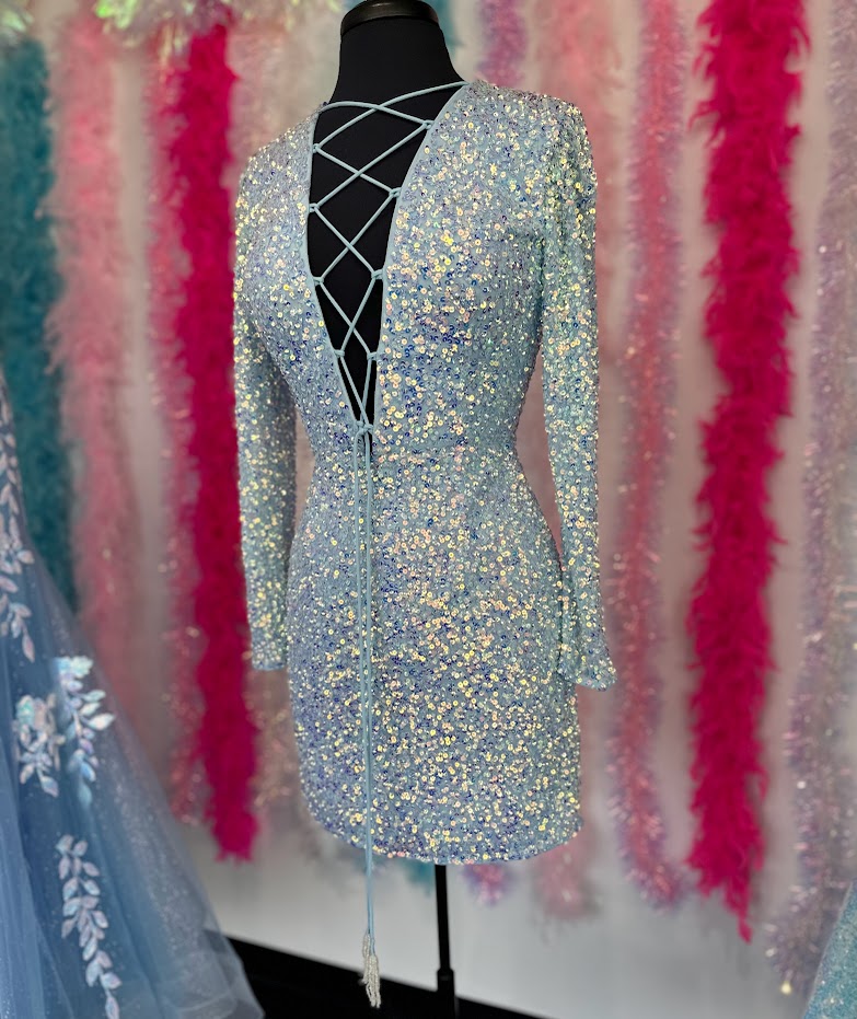 Ashley Lauren 4512 Size 6 AB/Sky Short Fitted Sequin Long Sleeve Homecoming Dress Cocktail Gown