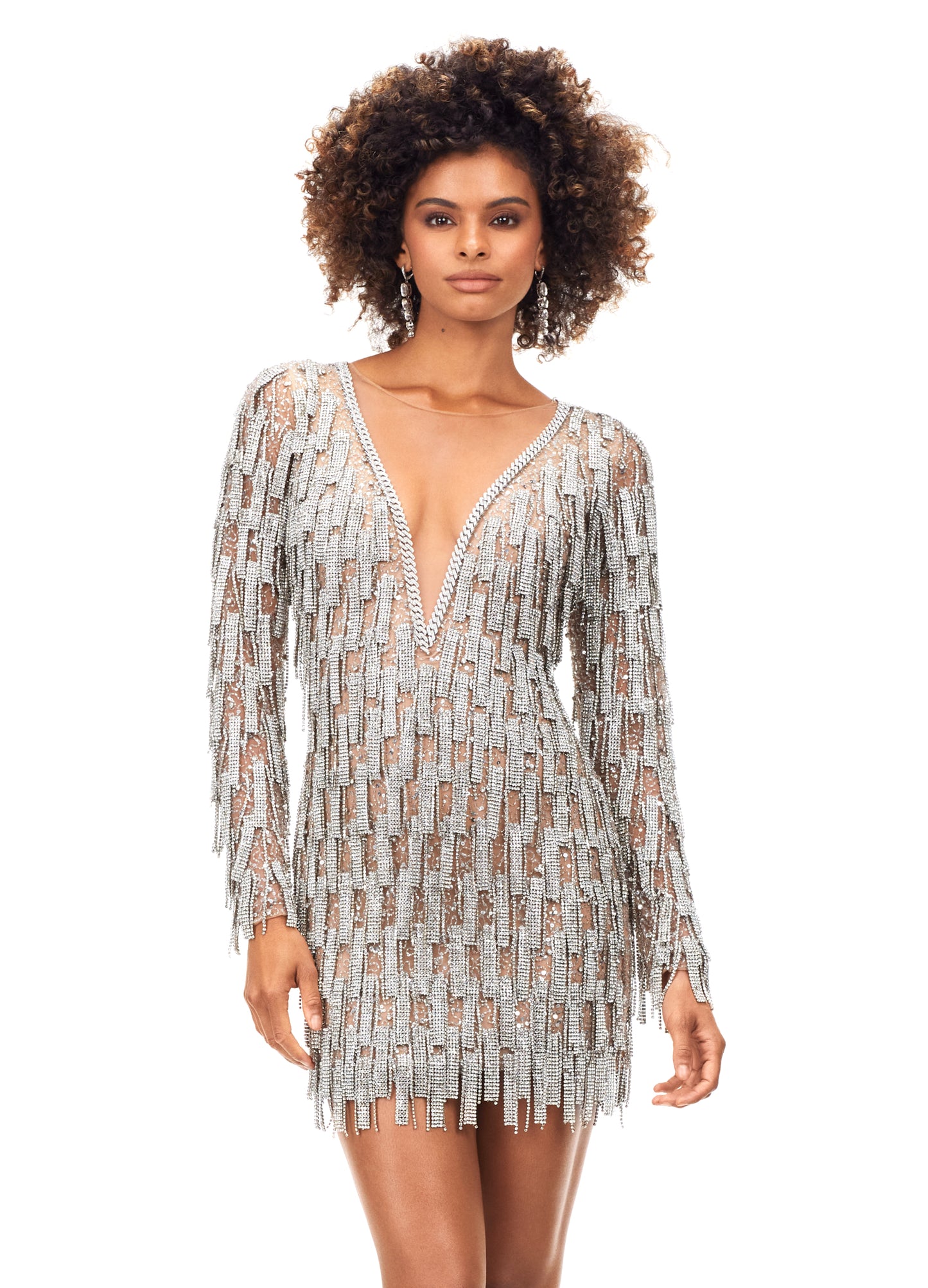 Ashley Lauren 4569 Beaded Cocktail Dress with Fringe Fur Neckline