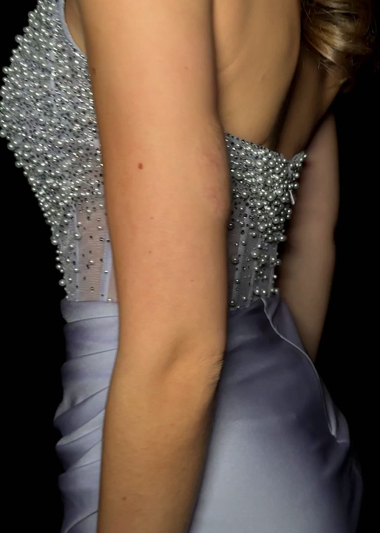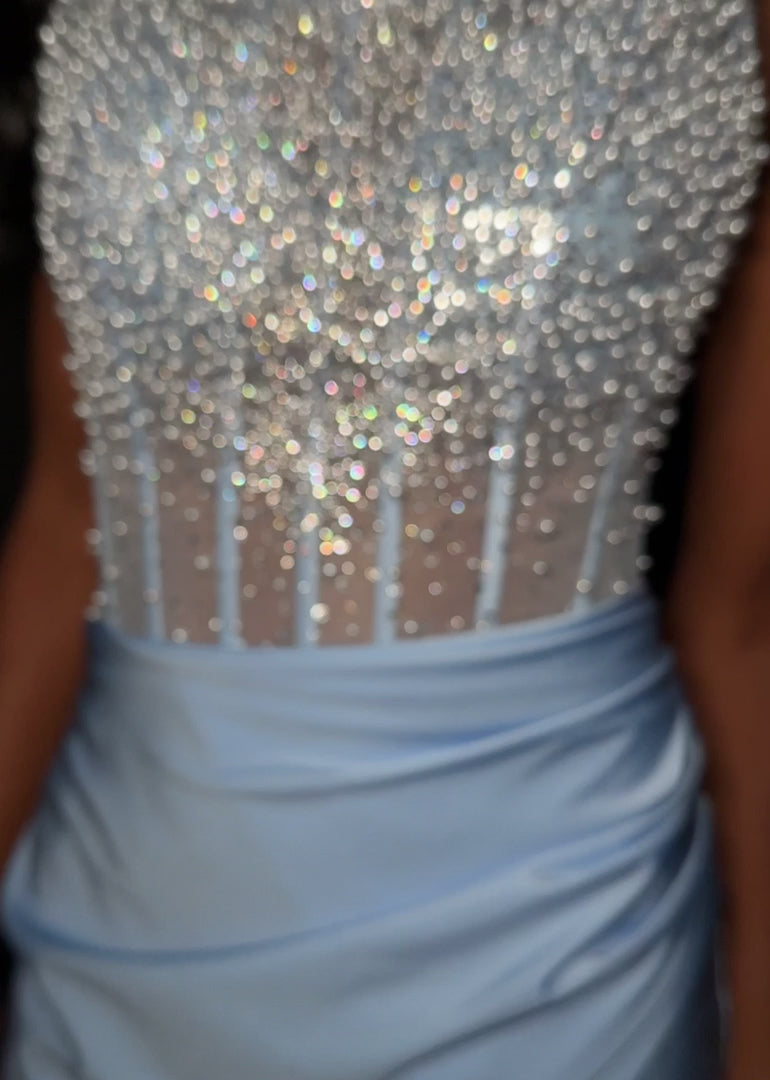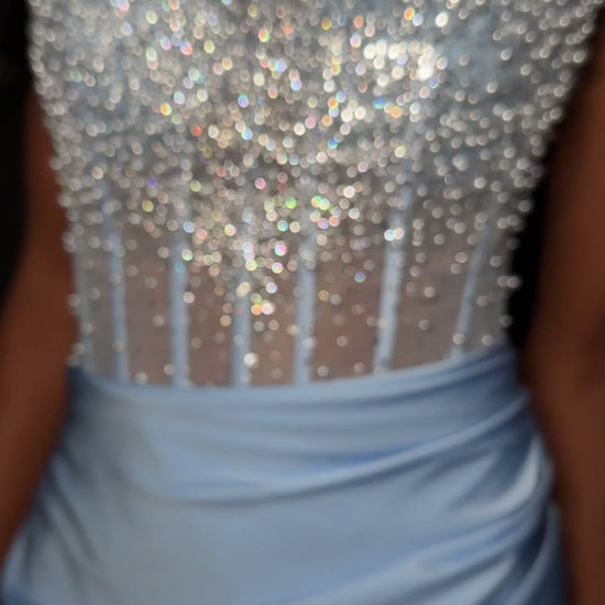 Ashley Lauren 4923 Pearl Crystal Corset Homecoming Dress Sheer Slit Ruched Formal Gown