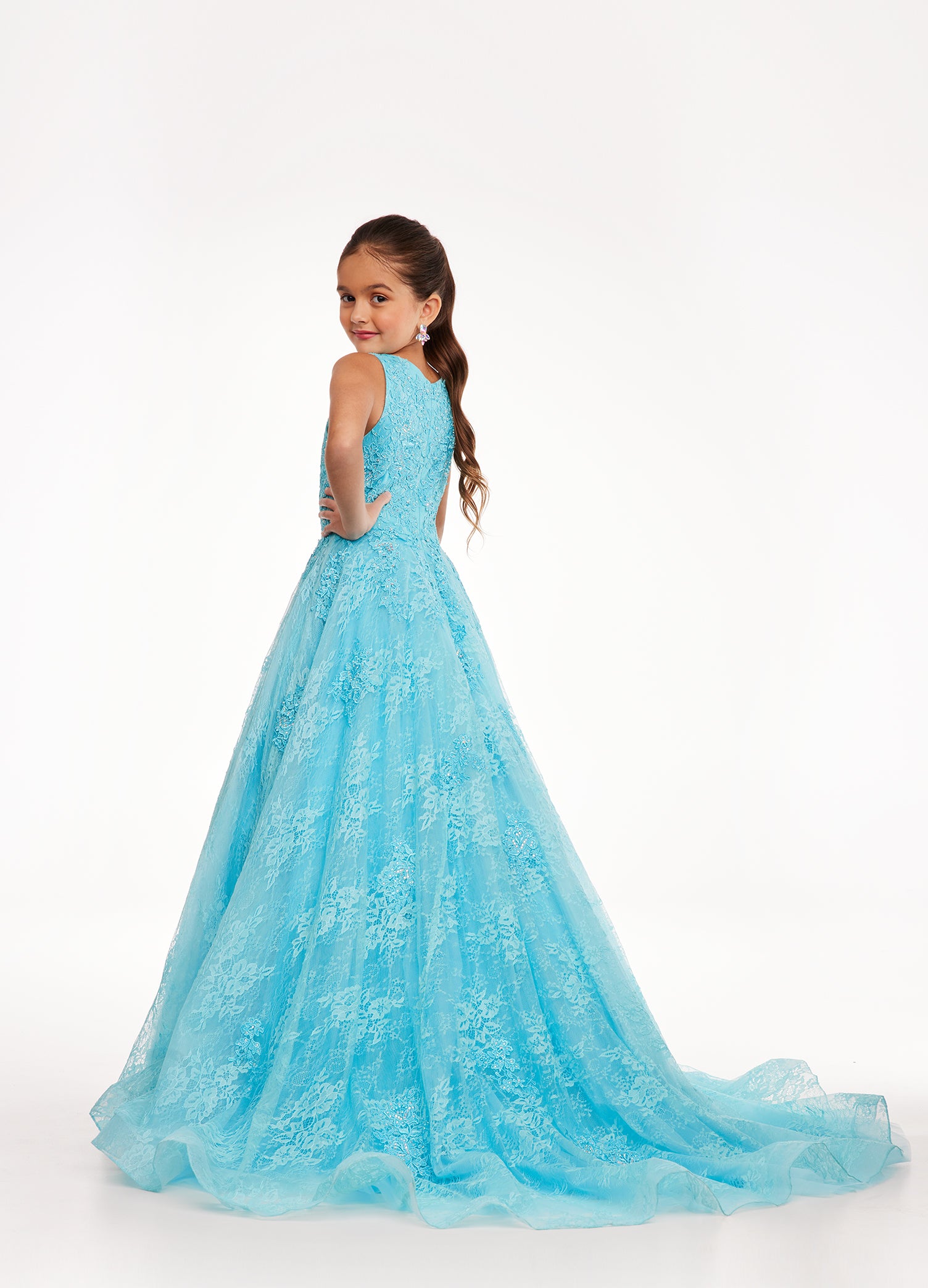Ashley Lauren Kids 8073 Girls Long Lace A Line Ball Gown Pageant Dress High Neck Lovely lace gown featuring a crew neckline embellished with lace applique and AB stones throughout the bodice and skirt.