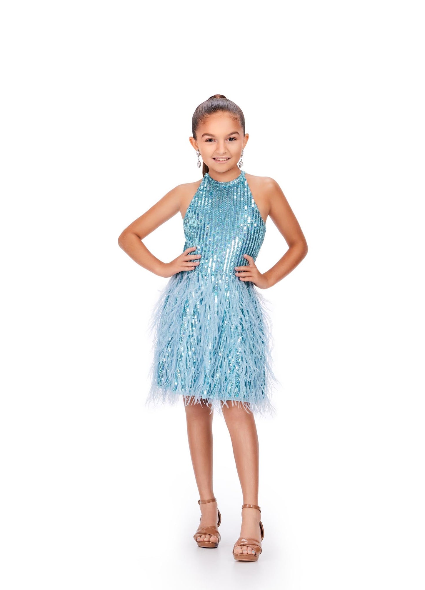 Ashley Lauren Kids 8196 Fully Beaded Halter Top With Feather A-Line Skirt Girls and Preteens Dress. Fun and sassy! This A-line, fully beaded cocktail dress features a halter neckline and feather details on the skirt.