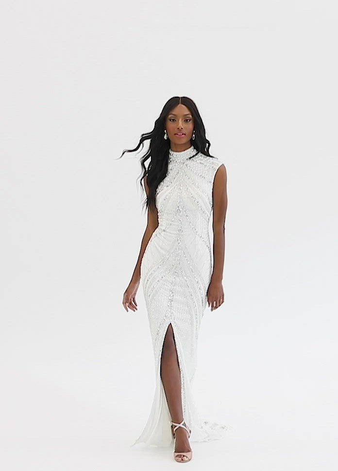 Look like a goddess in this fitted high neck dress that is fully beaded with an intricate bead pattern from head to toe. This dress has cap sleeves, a sweeping train and a center slit. Stunning Classy & Glam wedding Dress or Bridal reception gown,