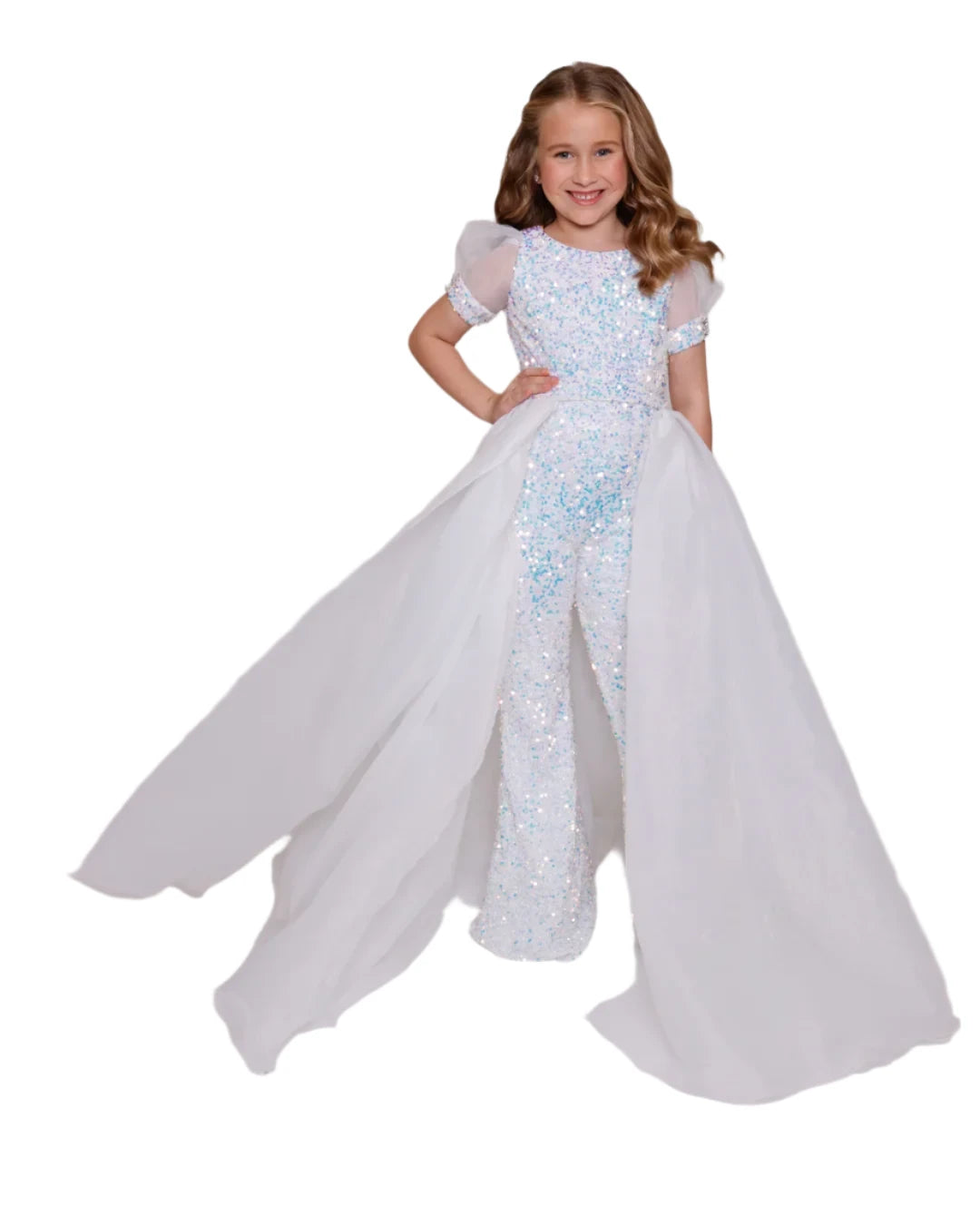 Introduce your little girl to the world of pageantry with the Ava Presley 38044 Girls Sequin Pageant Jumpsuit. Featuring a sparkling sequin design and a chic overskirt, this jumpsuit is not only fashionable but also comfortable with its puff sleeves and bell bottom. Perfect for formal occasions, give your child the confidence to shine on stage. The Ava Presley 38044 jumpsuit blends sparkle and elegance with its sequin bodice and flowing detachable overskirt. With its short puff sleeves and glittering design, this outfit is perfect for making a unique statement at pageants or special events. The combination of a playful jumpsuit and a dramatic long skirt gives this ensemble a show-stopping appeal.