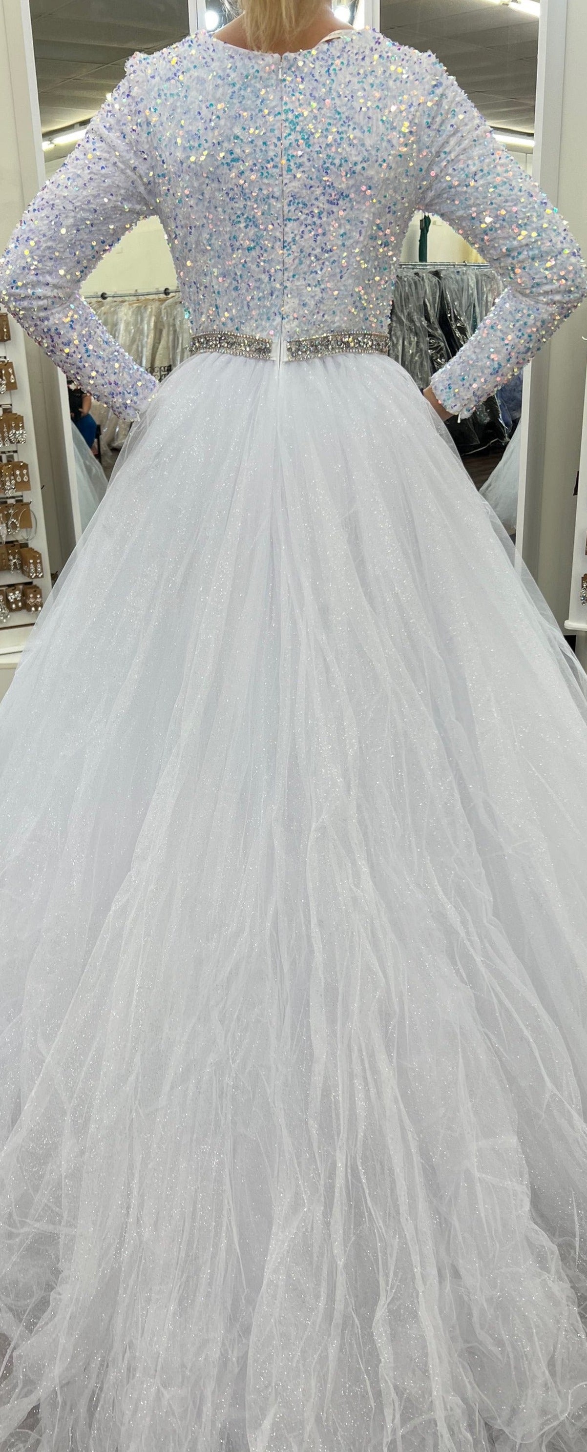 Ava Presley 38332 Size 12 Iridescent White Long Sleeve Velvet Sequin Shimmer A Line Ballgown Prom Dress Pageant Gown
