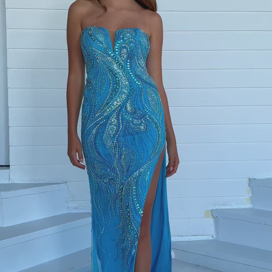 This Ava Presley 39219 long prom dress exudes elegance and sophistication. The fitted silhouette, strapless design, and sweetheart neckline beautifully showcase your figure, while the intricate beaded detailing adds a touch of glamour. With a high slit and formal pageant gown style, this dress is perfect for any special occasion.