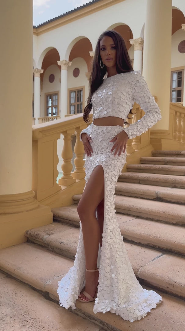 Ava Presley 39246 Long Prom Long Sleeve 2 Piece Glass Cut Mermaid Skirt High Slit Formal Pageant
