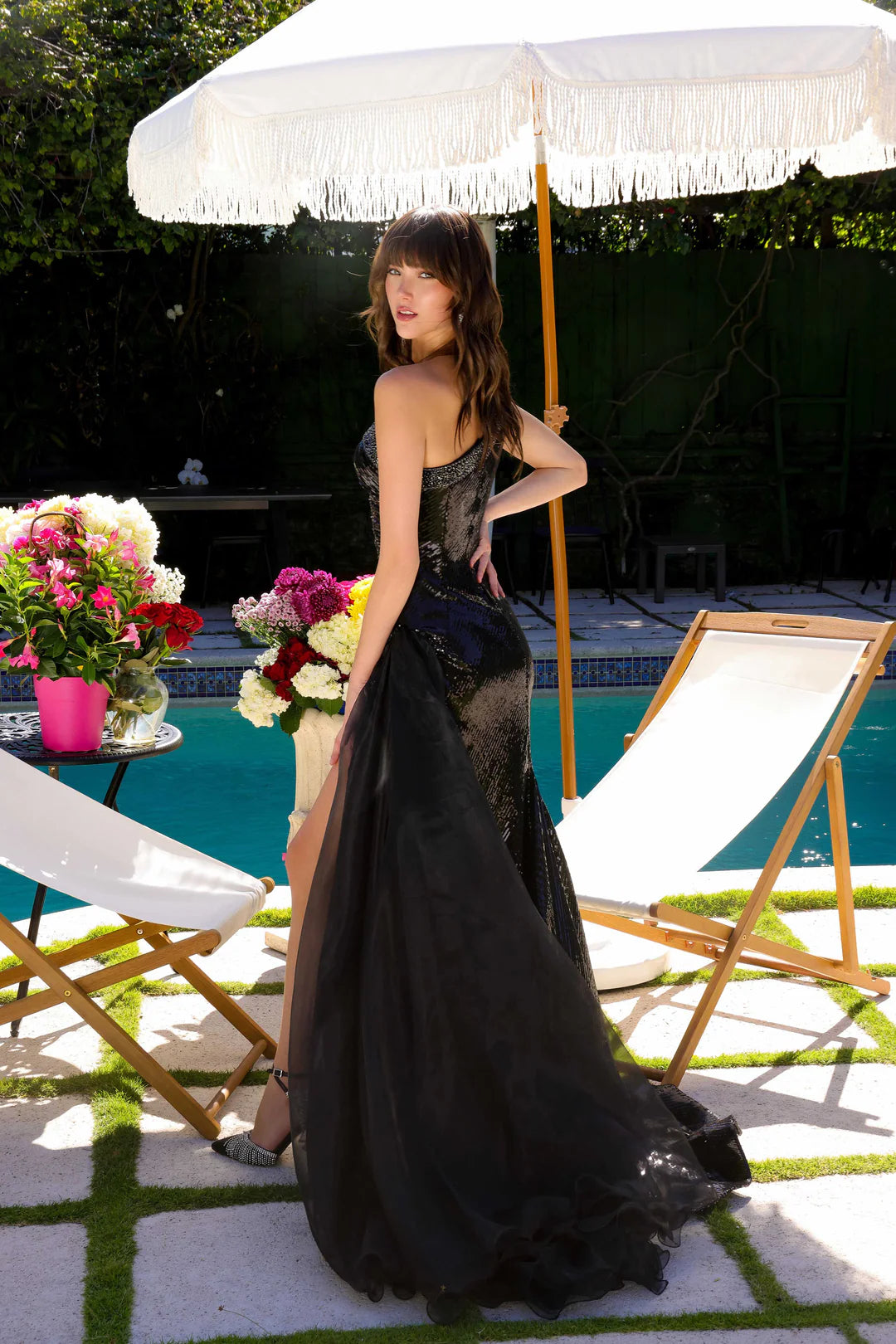 Elevate your next formal event with the stunning Ava Presley 39572 Long Sequin Pageant Dress. The asymmetrical one-shoulder design and thigh-high slit add a touch of glamour, while the sequin detailing creates a shimmering effect. Make a statement and stand out from the crowd in this eye-catching gown. Fitted one shoulder sequin gown with beaded details, a high slit, and organza side train. This stunning dress is perfect for pageants and homecoming court!