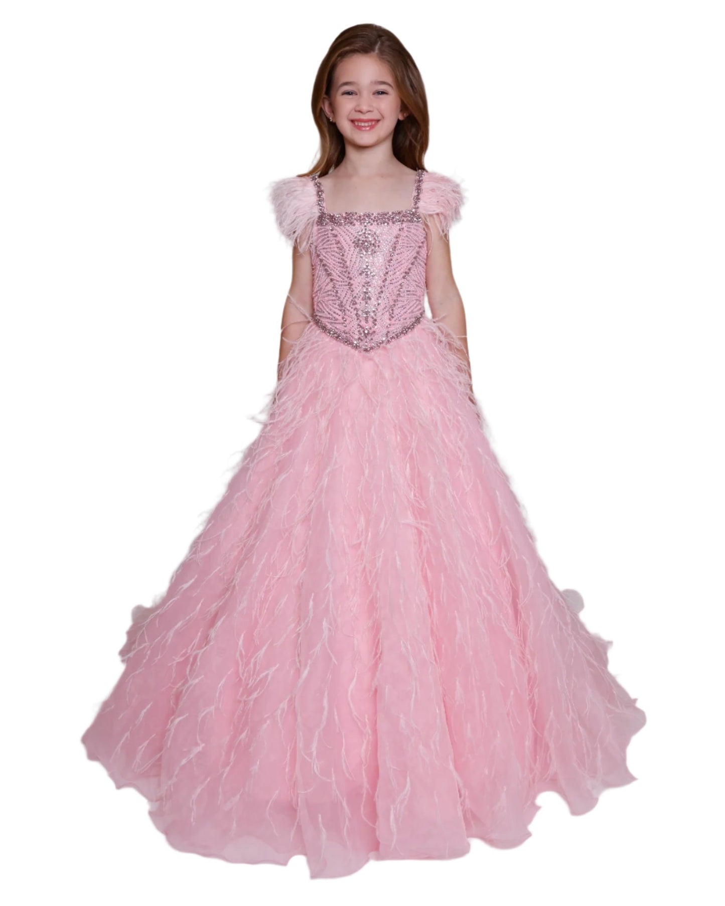 Elevate your little girl's pageant look with the Ava Presley 39889 formal dress. This breathtaking ballgown features a sparkling crystal bodice and delicate feather detailing on the cap sleeves. With its elegant silhouette and luxurious details, it will surely make her shine on stage. Make a grand entrance in this Ava Presley 39889 full-length gown, featuring a beautifully embellished bodice that sparkles with intricate details. The feather-like texture on the shoulder straps and flowing skirt adds a whimsical touch, perfect for standing out at any special occasion. With its exquisite craftsmanship and luxurious finish, this dress exudes elegance and charm for a picture-perfect look.