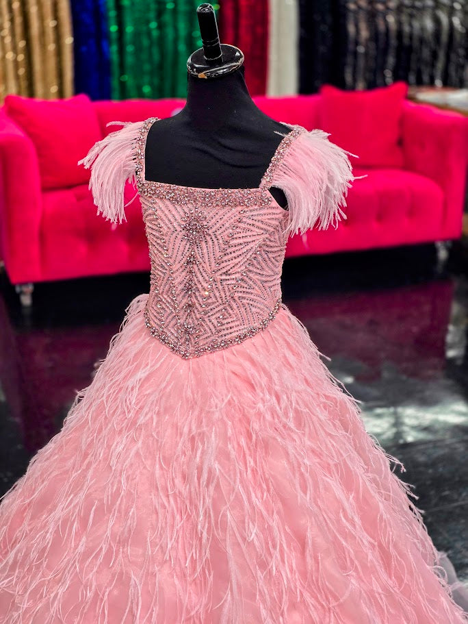 Ava Presley 39889 Size 8 Blush Girls Crystal Bodice Feather Ballgown Pageant Dress Cap Sleeve Formal