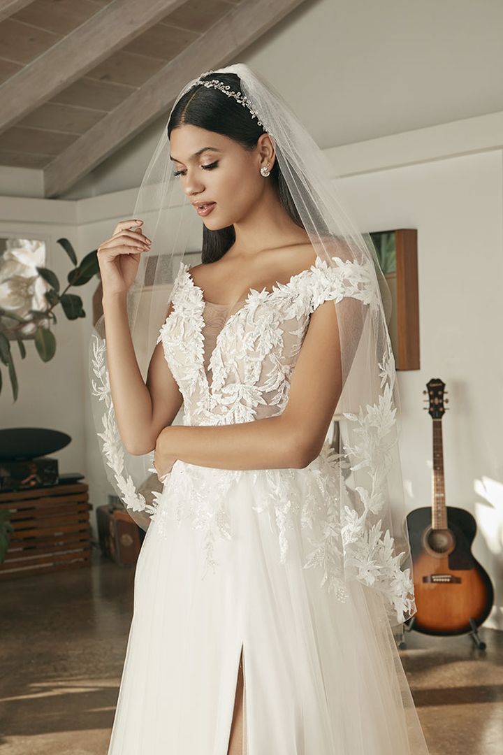 Soft, sweet, and inspired by the effortless beauty of nature, Style BL387 Remi by Beloved is a youthful vision of timeless romance. This A-line gown is intricately embellished with beading, sequins, and lace along the off-the-shoulder straps and plunging neckline. The delicate flower and vine lace appliques meander from the bodice down the front of the skirt, culminating in layers of voluminous, flowing tulle in a 60" train. A subtle split reveals just the right amount of leg, and is perfect for showing off your wedding day heels. Pair with matching 52" veil BL387V adorned with lace for a classic accompaniment.