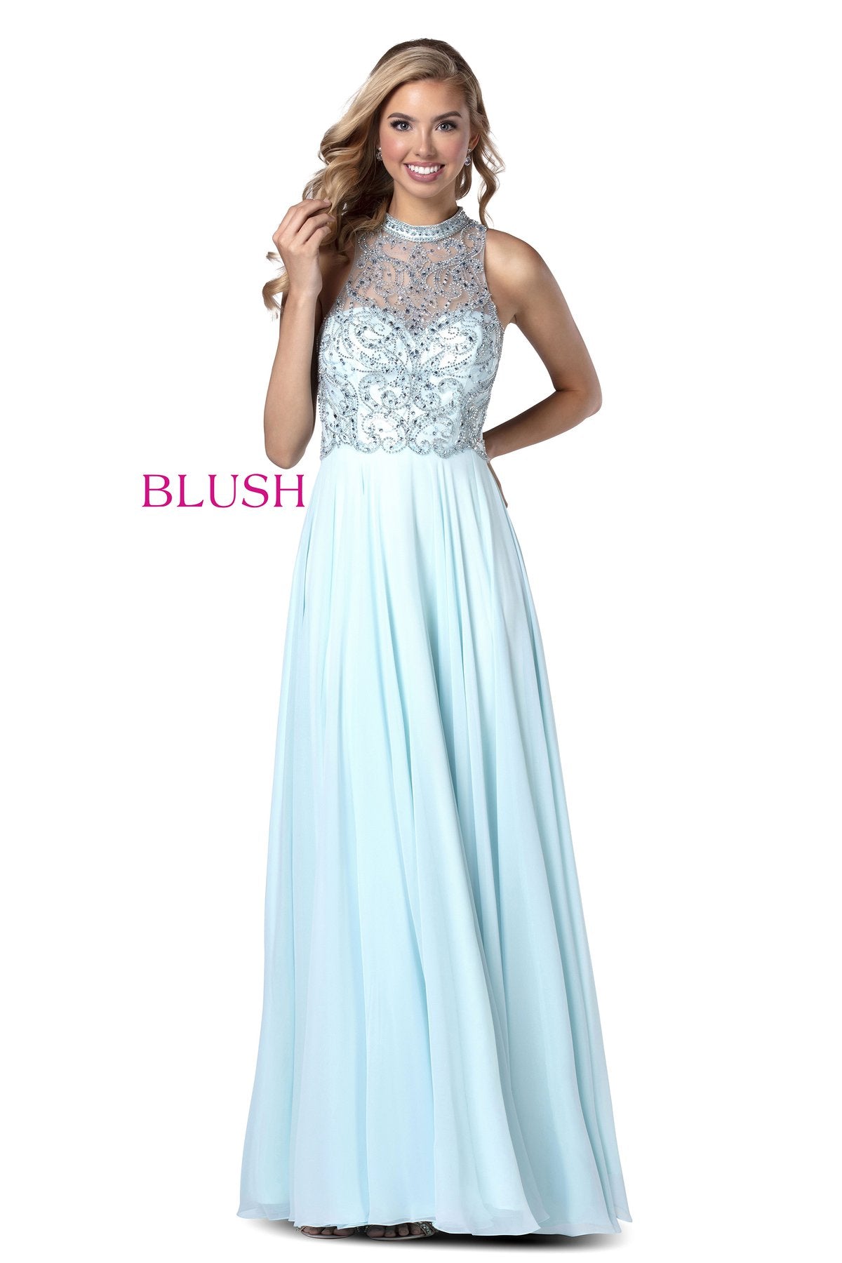 Blush Prom 11942 Size 10 White Chiffon A Line Prom Dress High Neckline Formal Gown