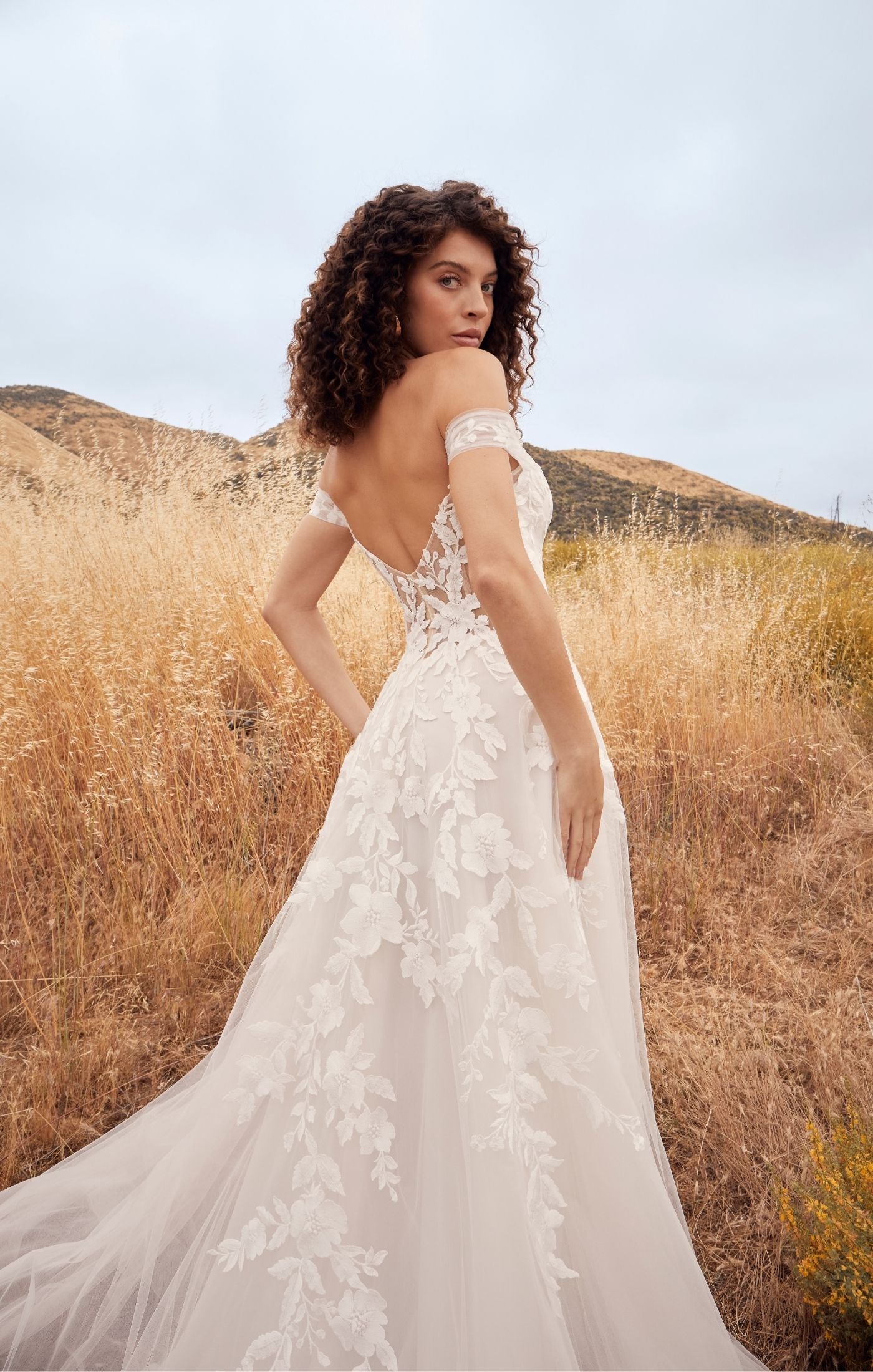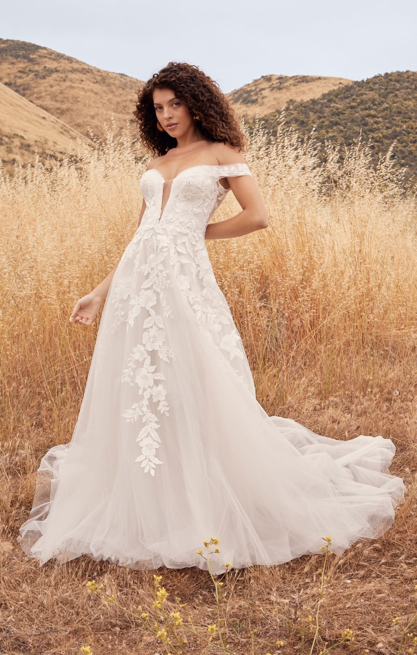 Casablanca Beloved BL433 Penny A-Line Floral Lace Deep V-Neck Off The Shoulder Tulle Train Wedding Gown