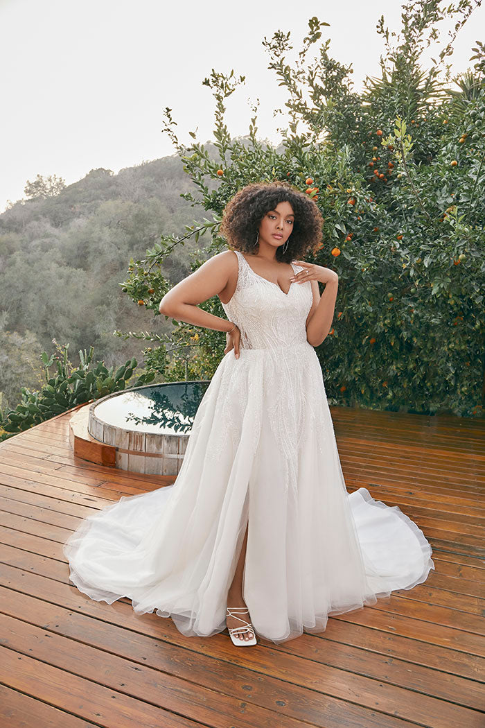 Reminiscent of storybook romance, exceptionally sweet Style BL386 Kimmy by Beloved is a treasure to behold. Layers of shimmering lace, beading and sequins whisper a love story of their own, exuding everlasting elegance. The embellishments continue through Kimmy's detailed straps, v-neckline, and picturesque sheer back framed by meandering beadwork. The structured bodice nips at the waist and keeps a feminine fit, before flowing into an exquisite A-line skirt with an elegant side split and 76" train. Equally stunning on all figures, Kimmy is also available in our curvy sizing. For an unforgettable fairytale addition, pair with matching veil BL386V.