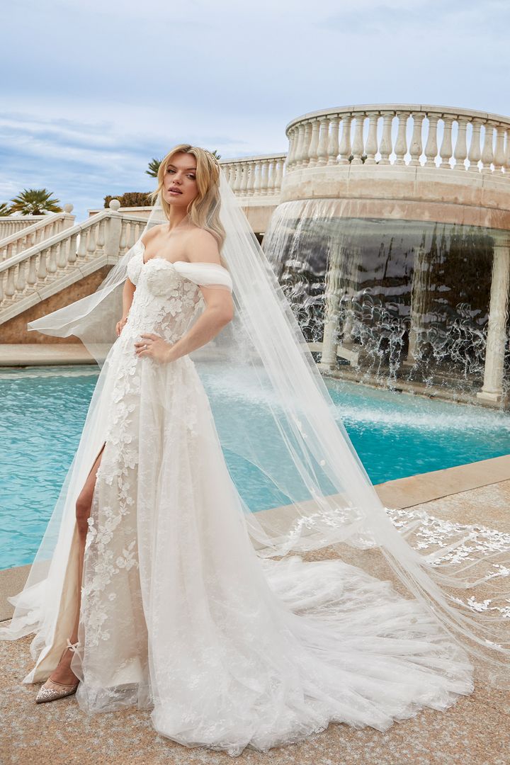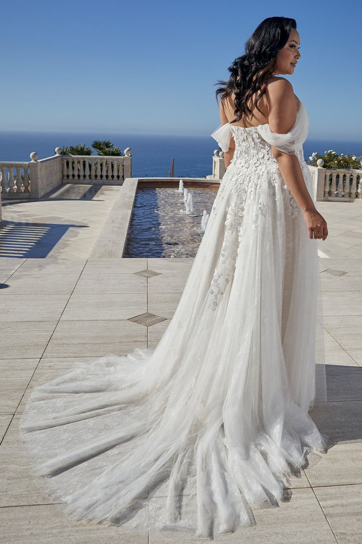 Hello, gorgeous! Style 2455 Mae is the romantic lace wedding dress you’ve been dreaming of. Whimsical layers of tulle, sparkle tulle and chantilly lace flow together to create the dimensional masterpiece that is the skirt on this universally flattering A-line style, flowing effortlessly into a 56 to 75 inch train. The sweetheart bodice on this beauty has the option to be worn strapless, or with charming off-shoulder tulle sleeves for two looks in one - just in case you need a quick change for the reception! 3D floral appliques add texture all around the bodice, trailing partly down the front and back of the skirt. A matching cathedral length veil is the perfect accessory to wow your guests in this modern boho fantasy! Additional matching cathedral veil style 2455V available to purchase.