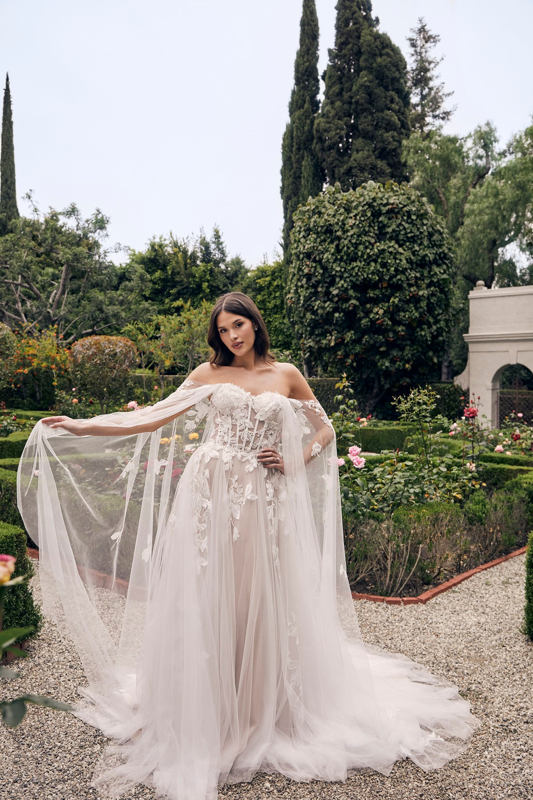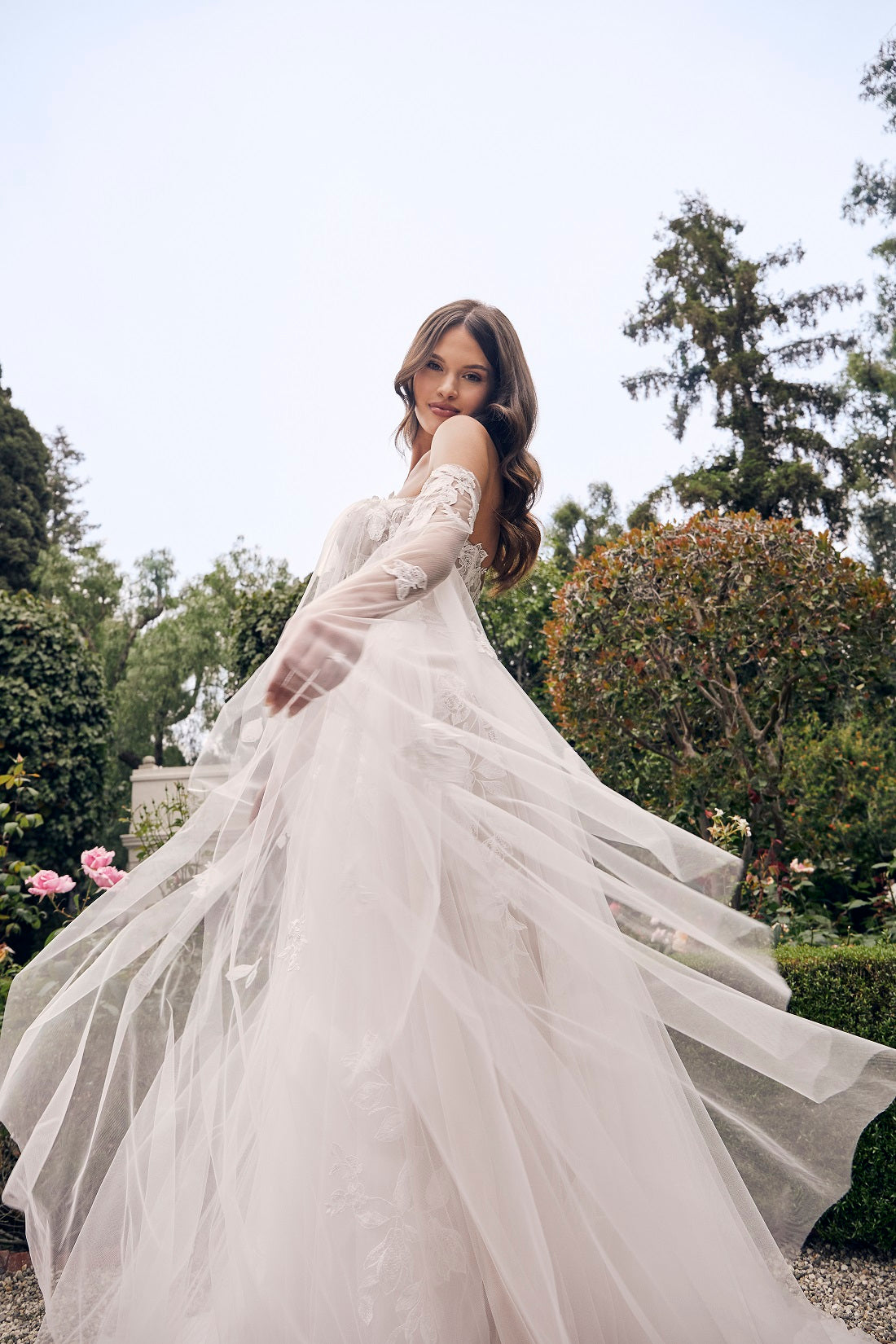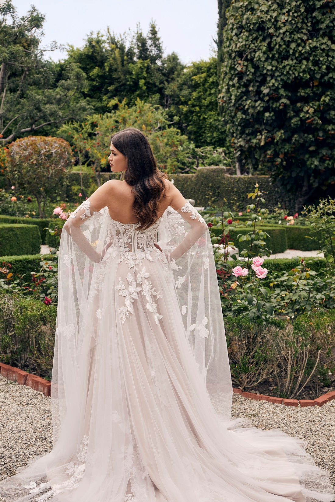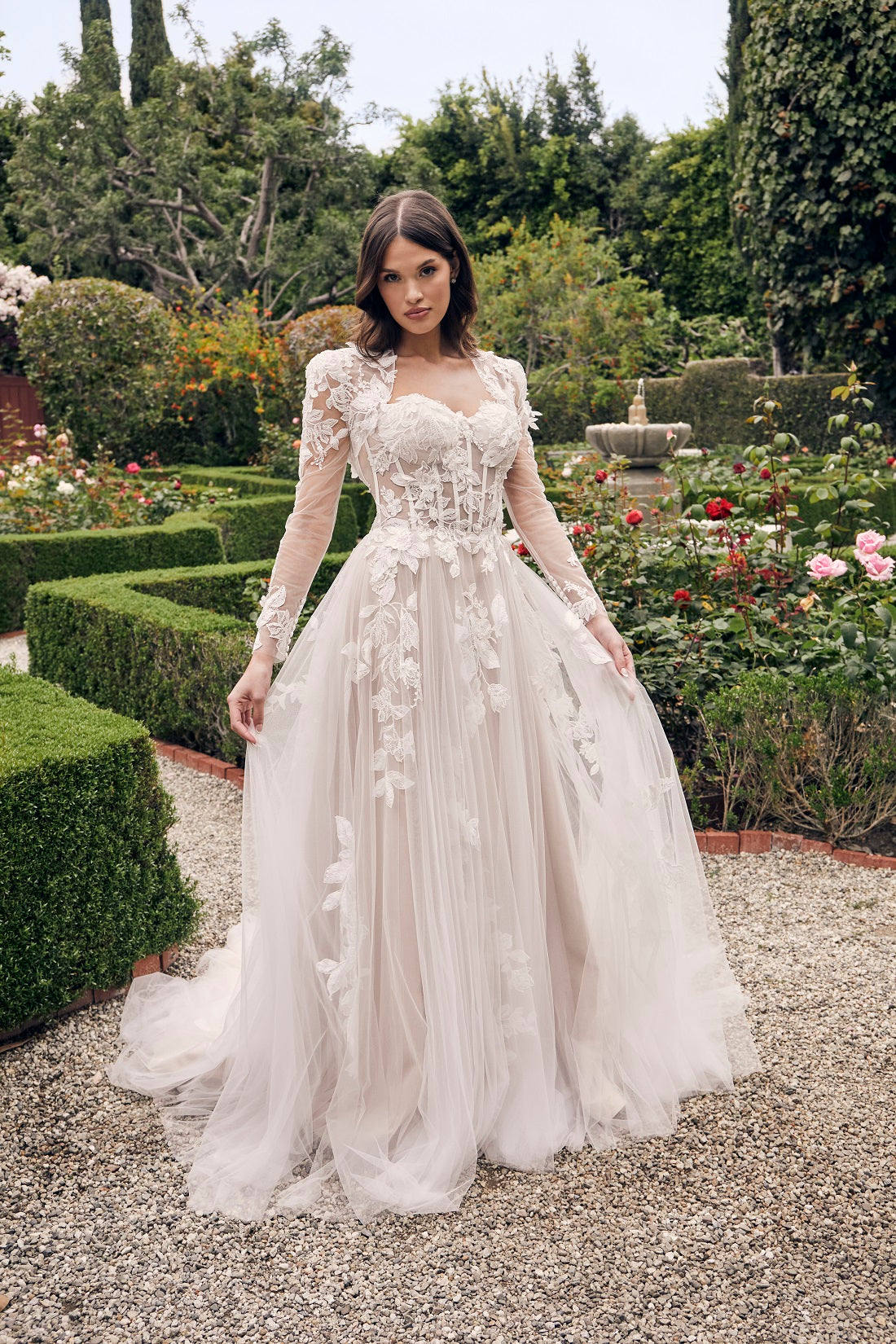Casablanca Bridal 2537 Adalaide A-Line Sheer Floral Corset Strapless Sweetheart Neckline Wedding Gown. 2537 Adalaide, a stunning A-line look consisting of a soft, gathered tulle features a flowy skirt and intricate corset bodice with a wealth of style details such as, exposed inner boning & transparent panels. Layered placements of floral appliques dot a strapless sweetheart bodice and can be paired with a matching jacket (2537JKT), veil (2537V) or detachable flowy sleeves (SL042), all sold separately.