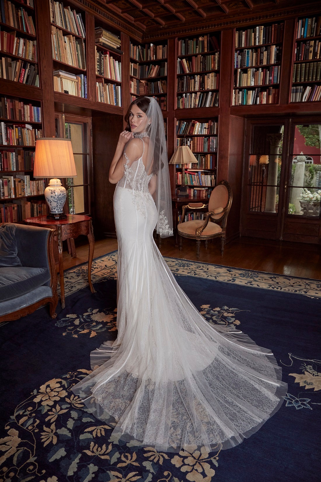 Casablanca Bridal 2542 Chanel Fit And Flare Sheer Corset Crystal Embellished Sweetheart Neckline Spaghetti Strap Wedding Gown. This stretch fabric fit and flare wedding dress is a mix of the contemporary clean trend with a side of sparkle. The illusion bodice with exposed boning is embellished with hand beading and crystals. Beaded spaghetti straps hold up a sweetheart neckline, with the option to add off the shoulder beaded sleeves sold separately (NK007). Slimming vertical piping follows the boning on the bodice down the skirt, providing a flattering lengthening touch.