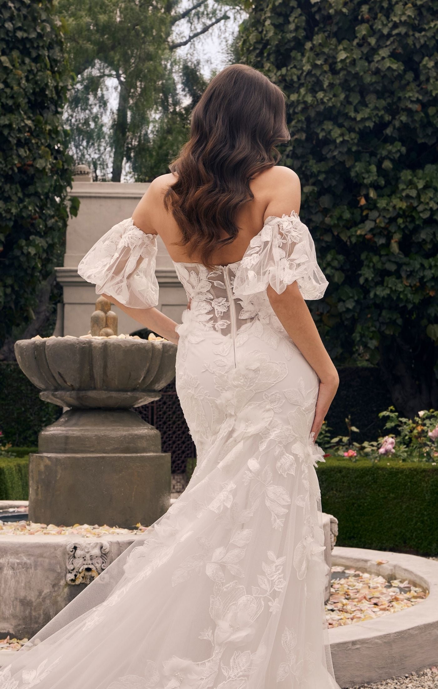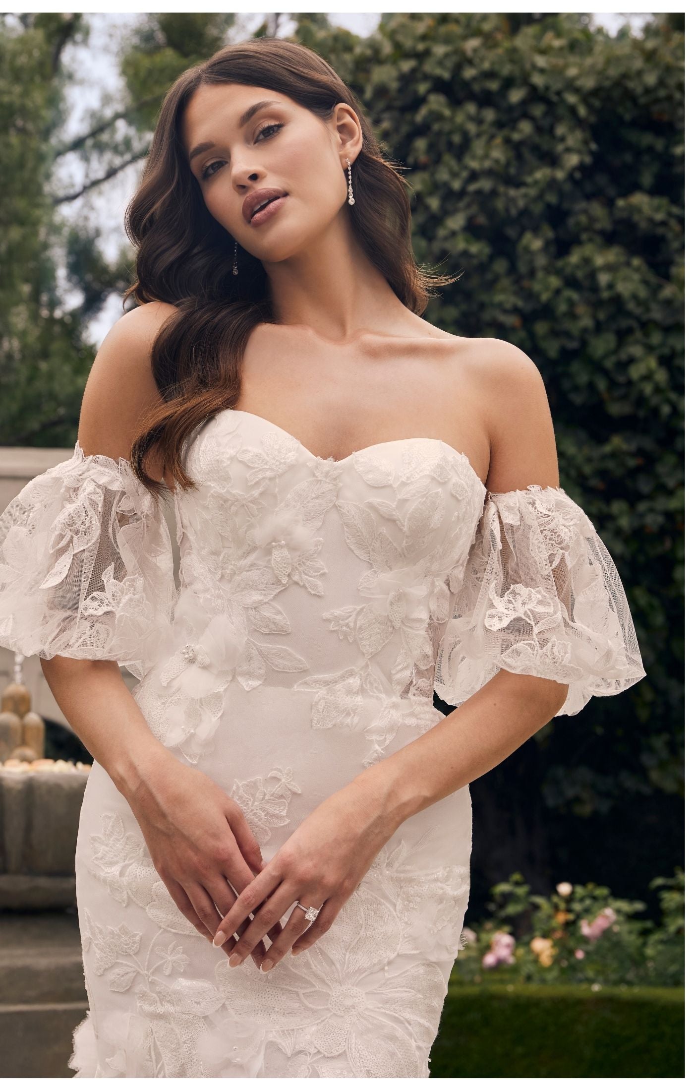 Casablanca Bridal 2552 Fit And Flare Strapless Sweetheart Neckline Floral Tulle Corset Train Wedding Dress. This beautiful fit-and-flare style is anything but ordinary. Stretch chiffon lines the entire gown, so you’ll be equally comfortable and glamorous all day long. A strapless sweetheart neckline is supportive, and the structure of the bodice is like no other with 13 pieces of boning. 3D floral lace with beading and sequins renders the dress from head toe. The jaw dropping 85-inch train is finished by an accordion tulle hem giving it an unforgettable look! For the bride who’s looking for that extra feminine touch, Patrice has optional detachable puff sleeves (SL044), sold separately.