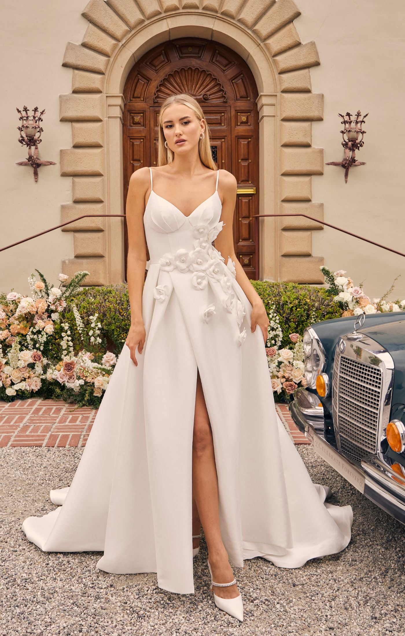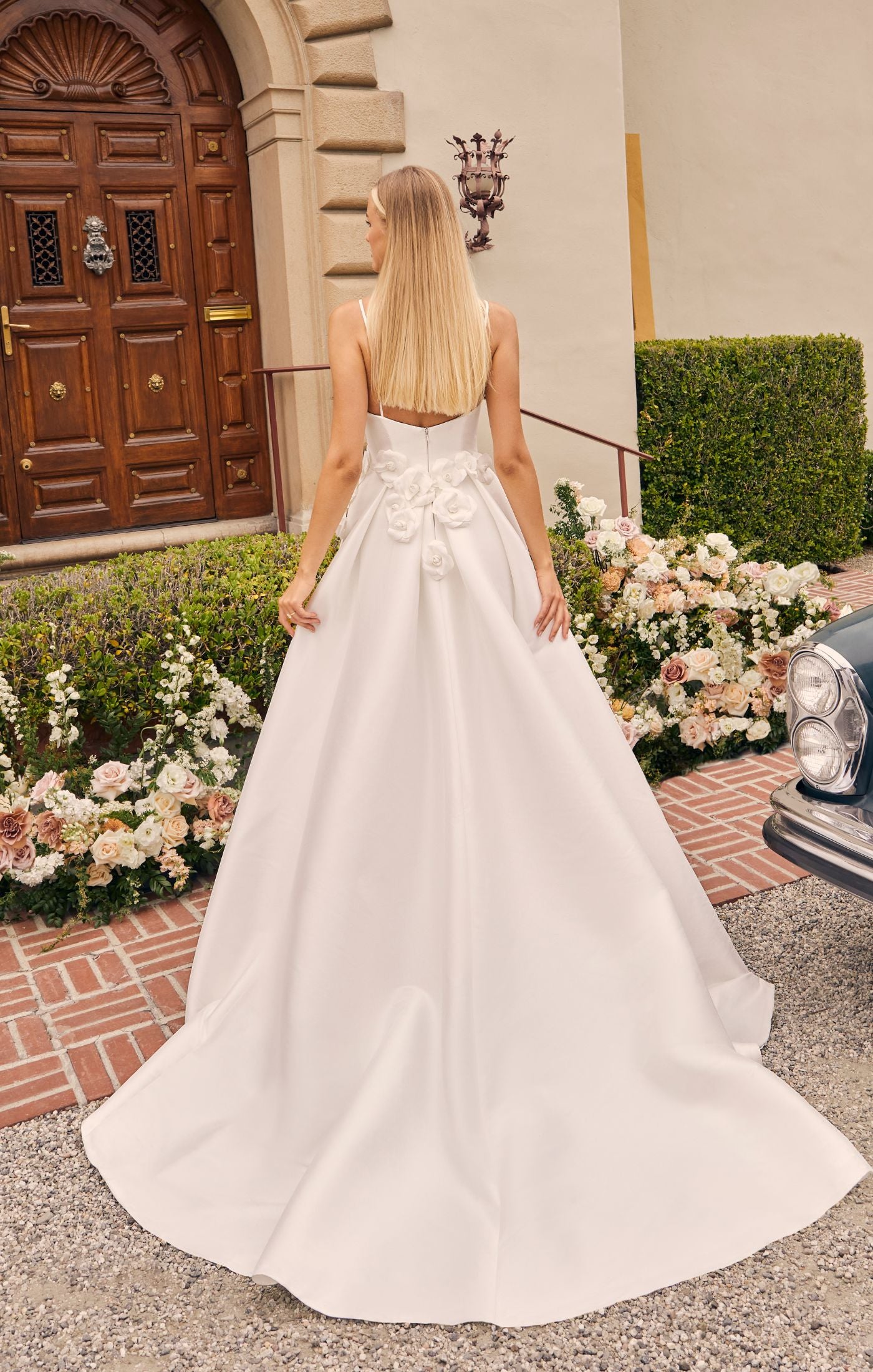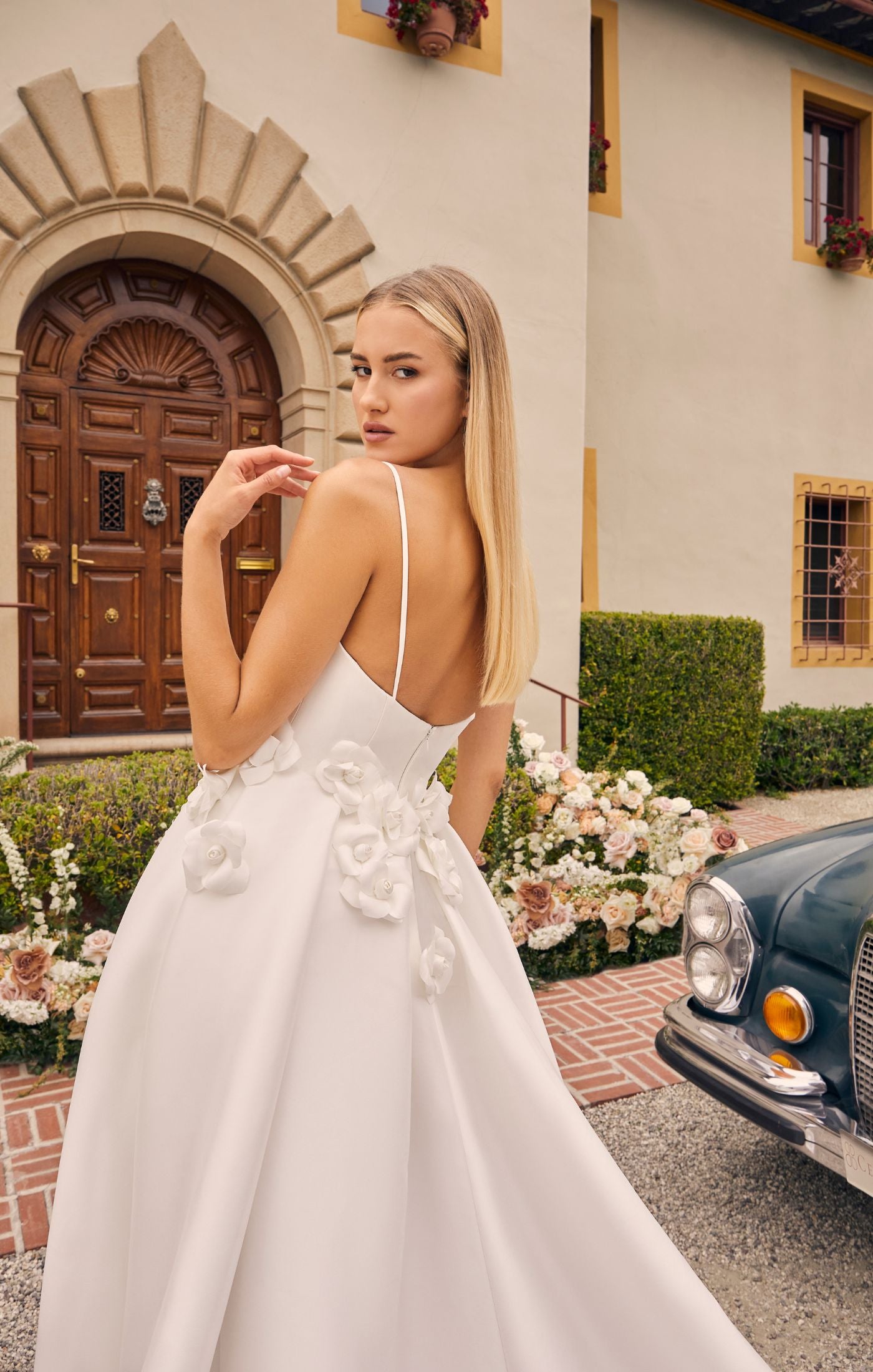 Casablanca Bridal 2556 A-Line Spaghetti Strap V-Neck Slit Train Wedding Gown. Prepare to be captivated by the sheer beauty of Style 2556 Bellisima, an exquisite A-line wedding dress that redefines effortless elegance. The spaghetti strap bodice of Bellisima features a flattering V-neckline, accentuating your décolletage and creating a delicate frame for your face. The pleated cups add a touch of femininity and provide subtle structure to the fitted bodice with a 15-piece boning count, ensuring a flawless fit that celebrates your natural curves. Crafted from luxurious Mikado fabric, Bellisima exudes a sense of refined beauty. Handmade Mikado 3D flowers adorn the gown, adding texture and dimension to its already breathtaking design. Each flower is meticulously crafted, creating a stunning visual effect that will leave your guests in awe. Adding a hint of allure, the thigh-high slit in the skirt adds a touch of modernity and allows for effortless movement as you dance the night away. Complete your bridal ensemble with our matching fingertip veil, designed to perfectly complement the beauty of Bellisima.
