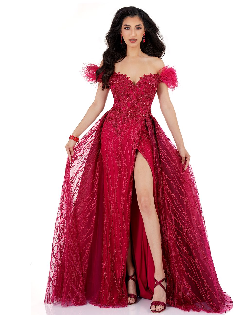 Cecilia Couture 2530 Feather Off Shoulder Overskirt Beaded Slit Prom Dress Pageant Gown Gorgeous Off-the-shoulder Sweetheart Neckline Gown by Cecilia Couture You are sure to steal the attention of the crowd as you show up in this magnificent Cecilia Couture dress. This absolute stunner graces an off-the-shoulder sweetheart neckline and fringe accented short sleeves. The overall fit is accented with sequin and beaded embellishments from head to toe while the skirt reveals a sensual thigh-high slit.