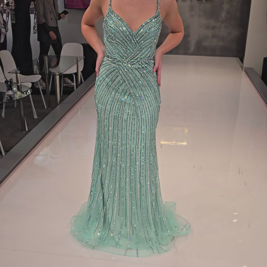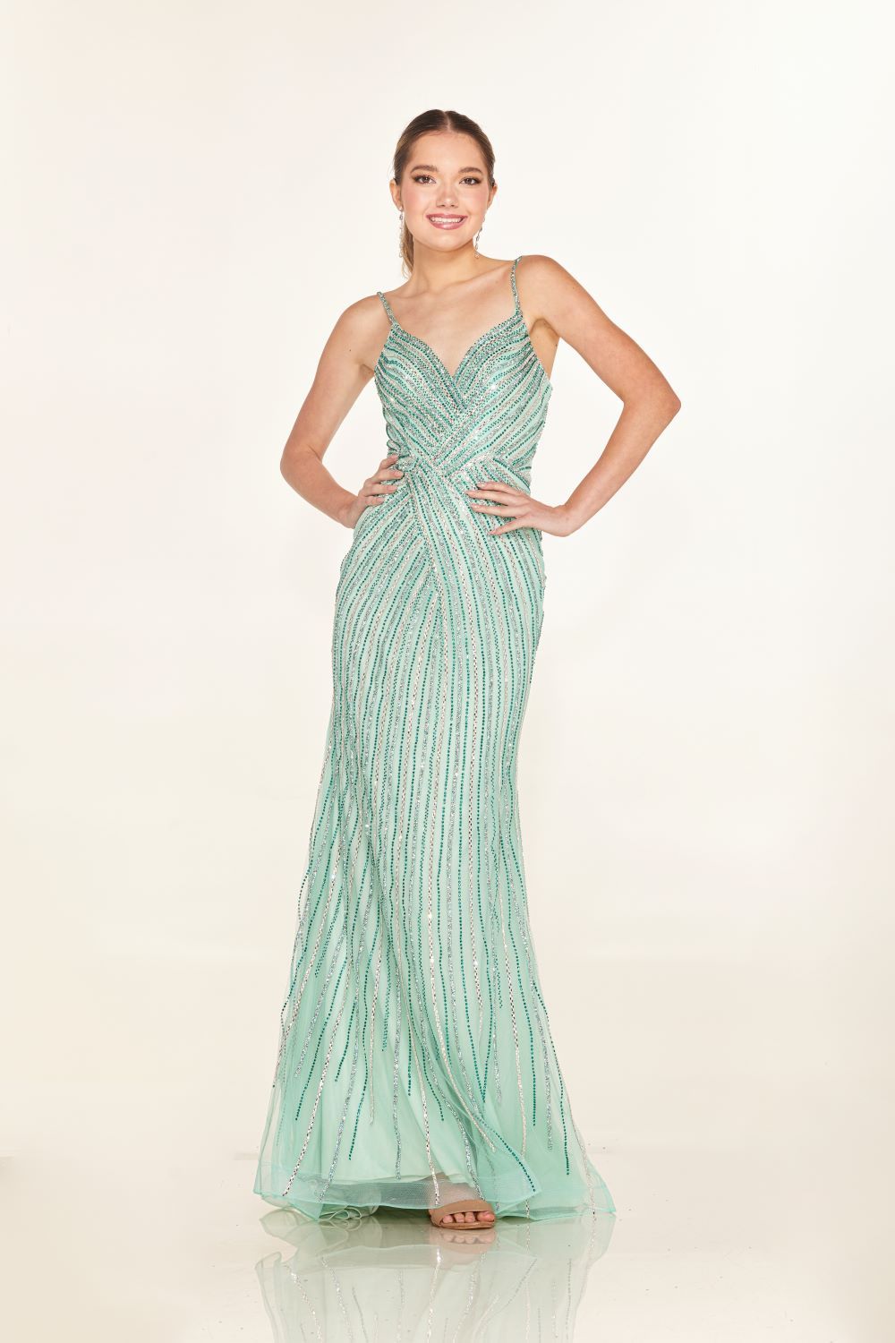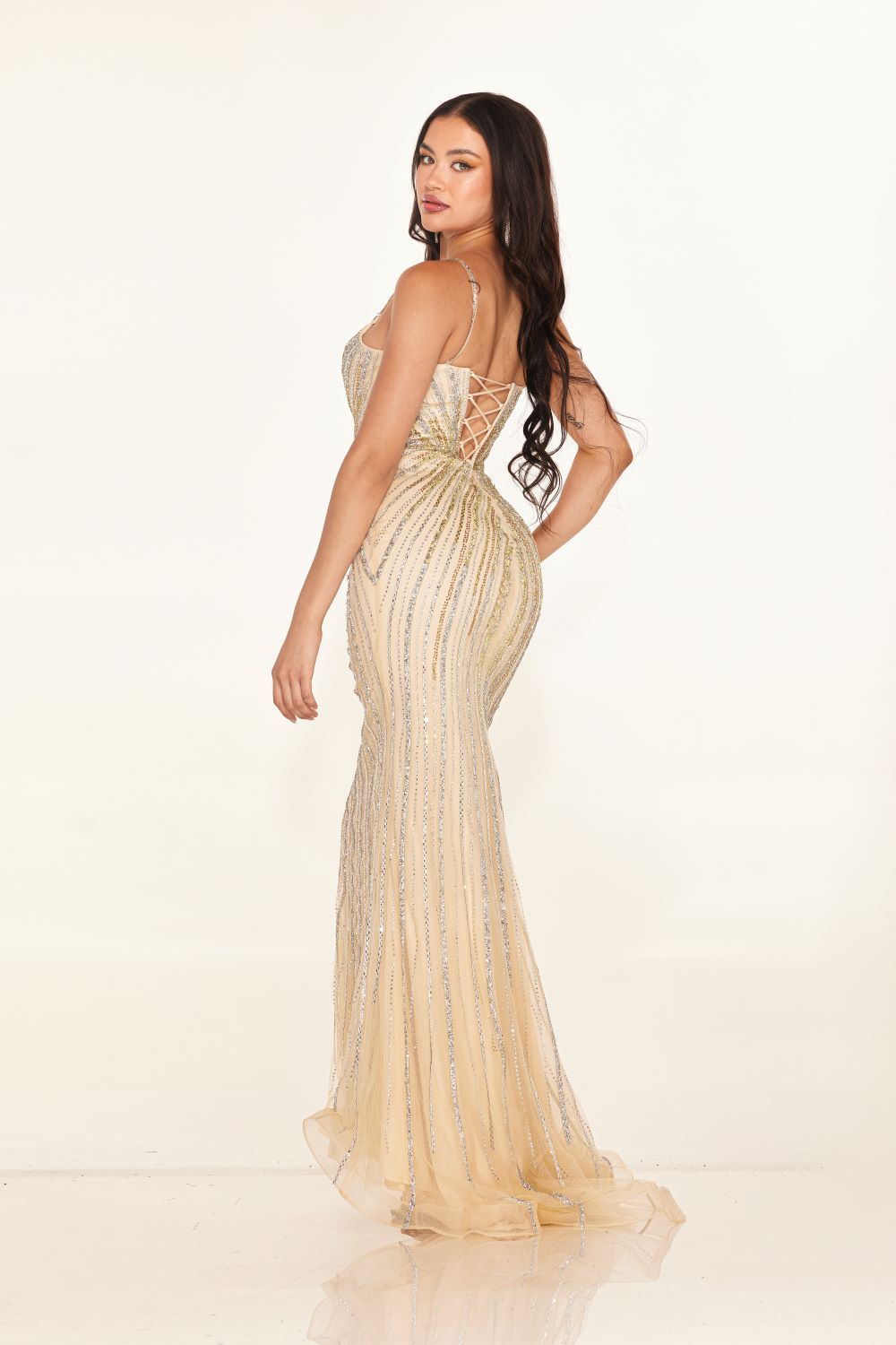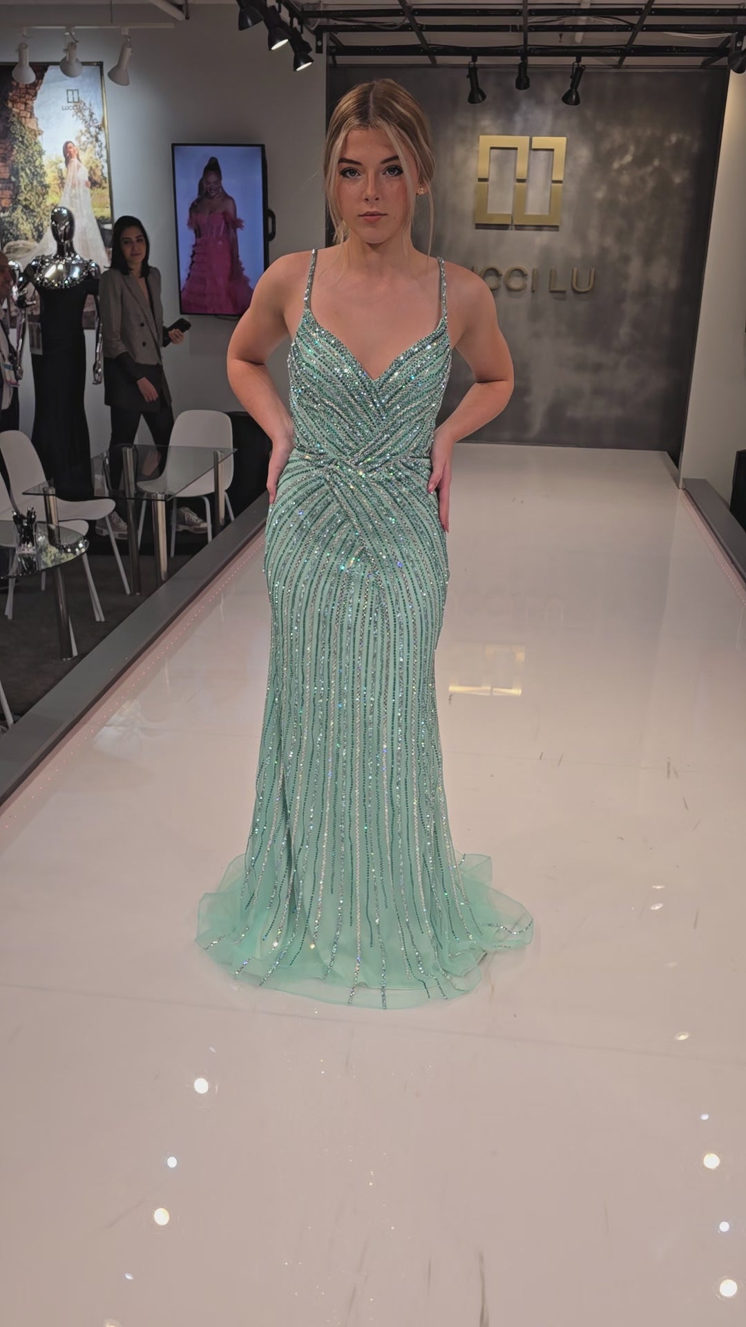 Cecilia Couture 2616 Long Crystal Prom Dress Corset V Neck Formal Evening Gown Shimmer
