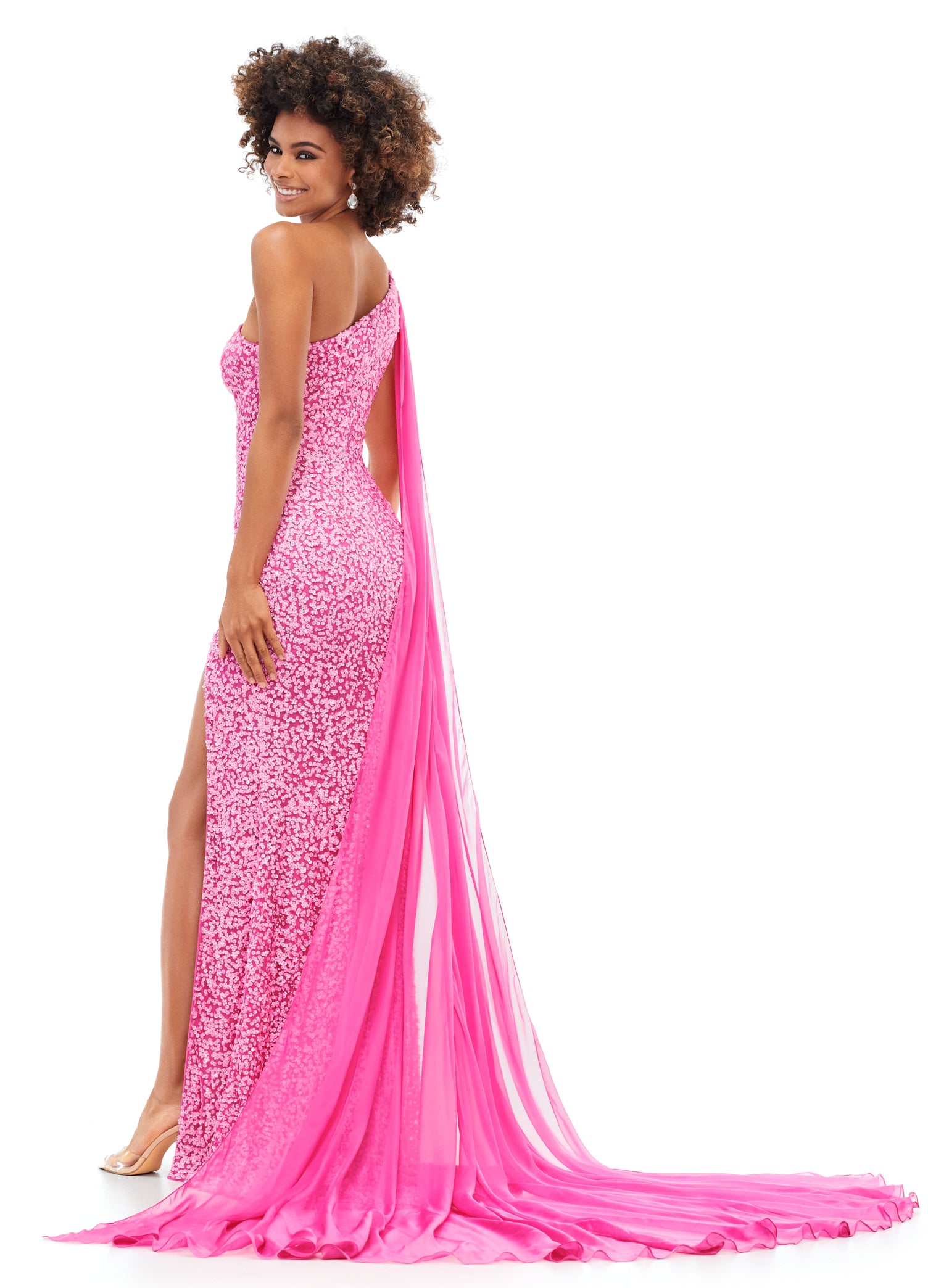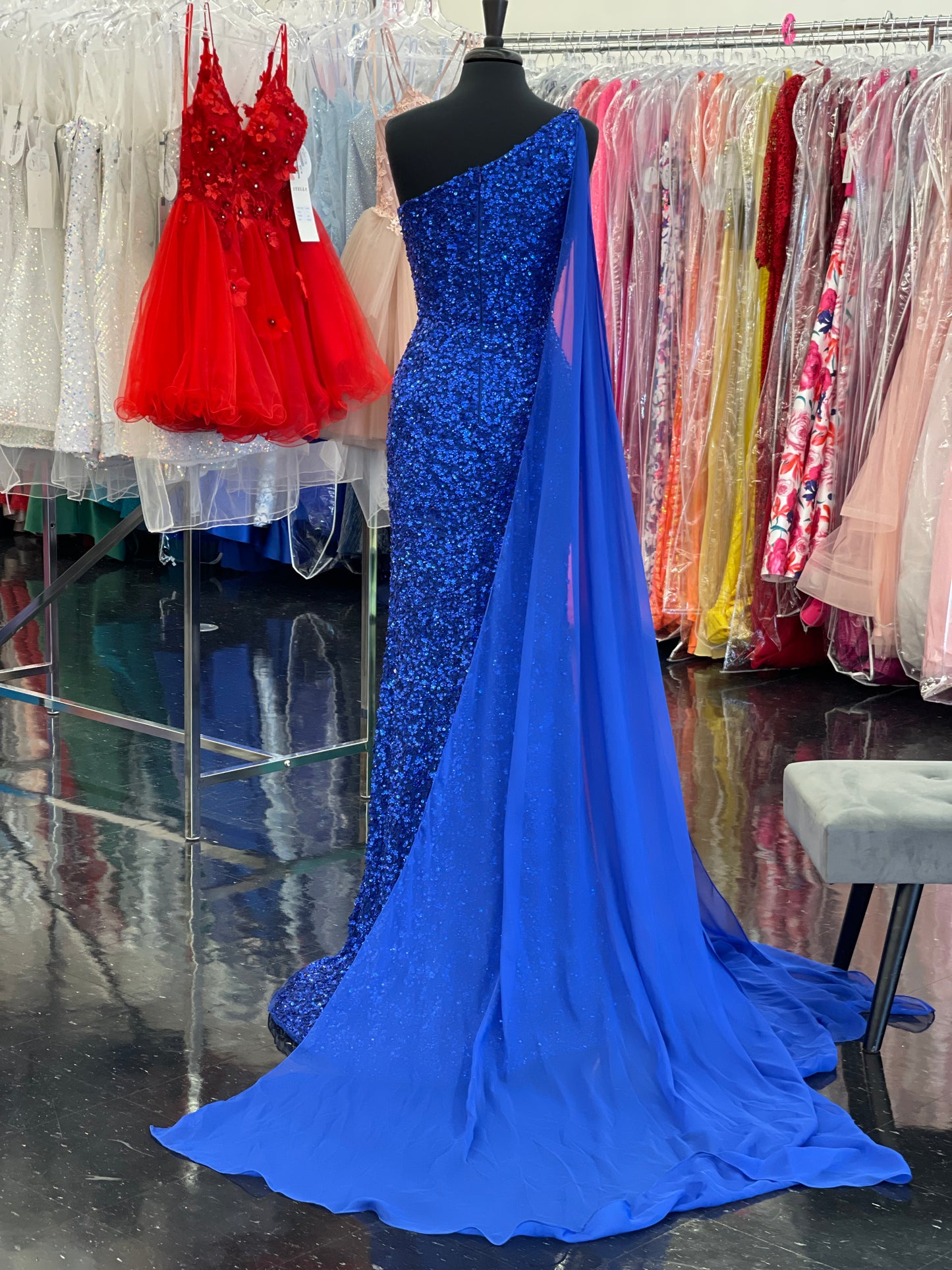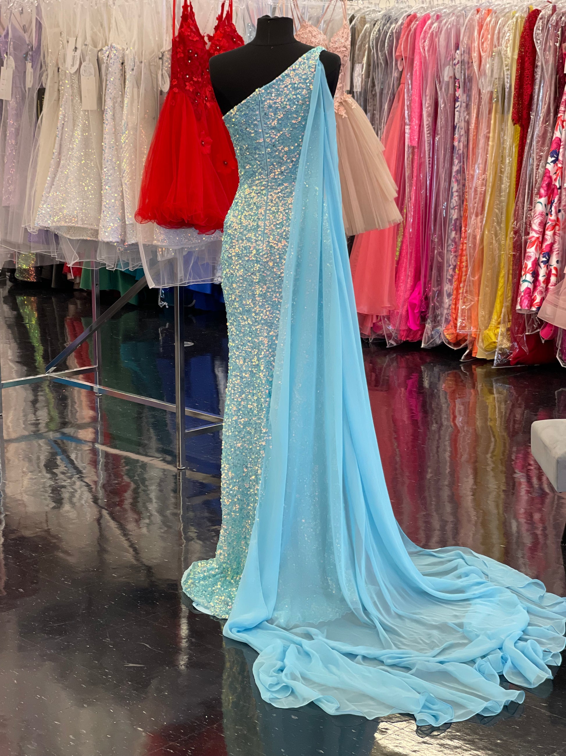 Ashley Lauren 11371 One Shoulder Prom Dress fully sequins with shoulder cape and slit.