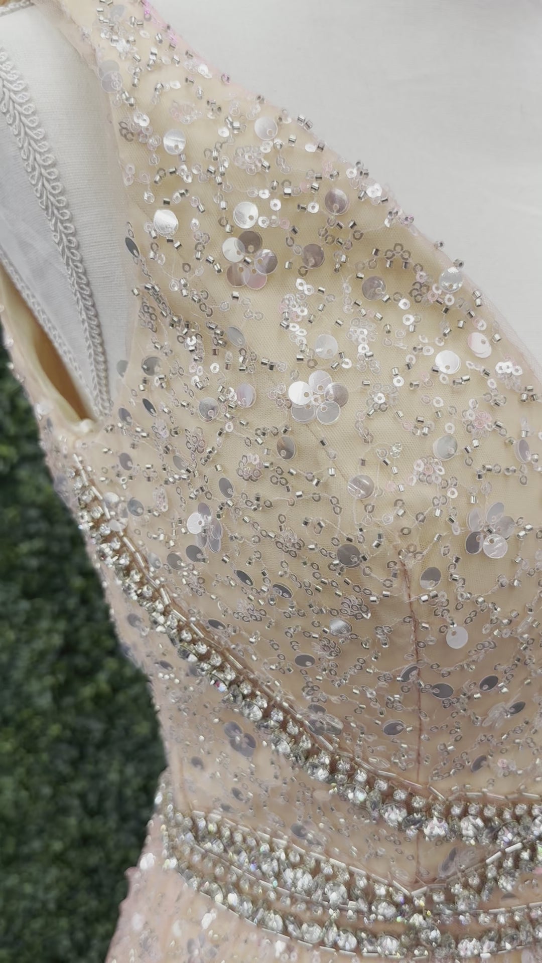 Johnathan Kayne 5400 Size 4 Champagne Long Beaded Sequin A Line Crystal Formal Evening Dress Gown V Neck