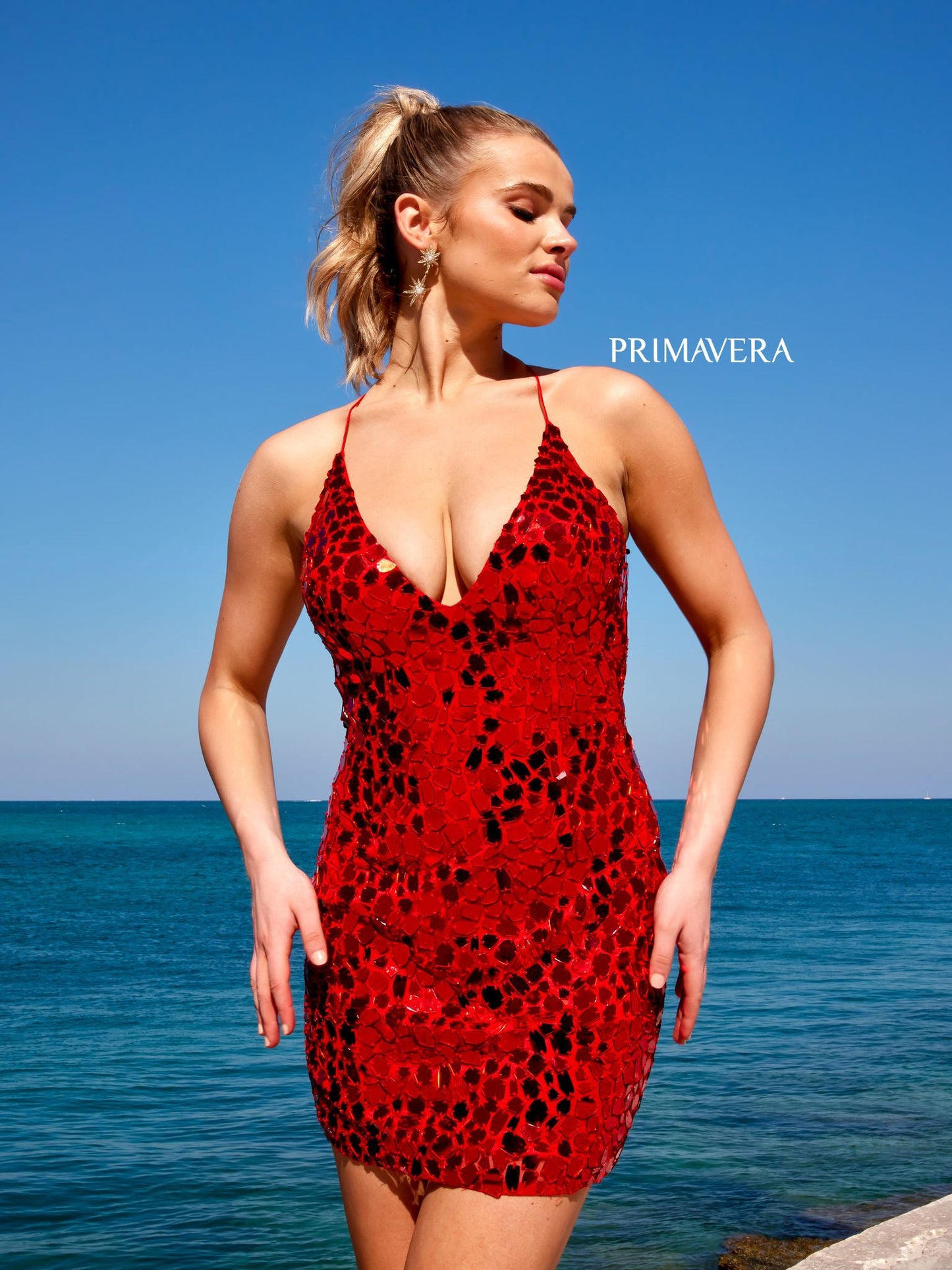 This Primavera Couture 4056 Cut Glass Open Tie Back V-Neck Cocktail Homecoming Dress is crafted with 100% premium fabric for maximum comfort and style. This outstanding design features an open tie back detail, V-neckline and shimmering cut glass embroidered fabric, perfect for making heads turn at a special occasion.