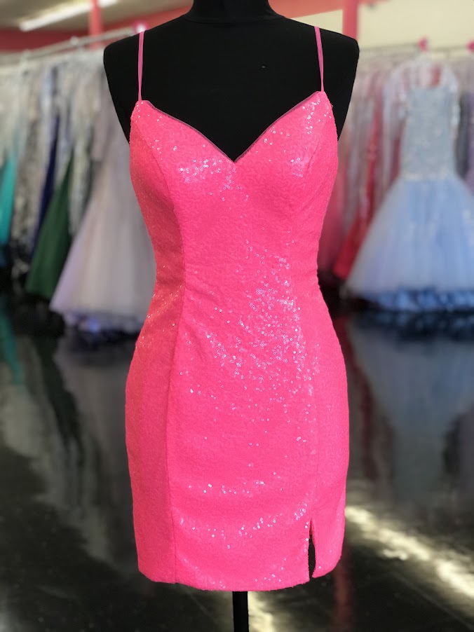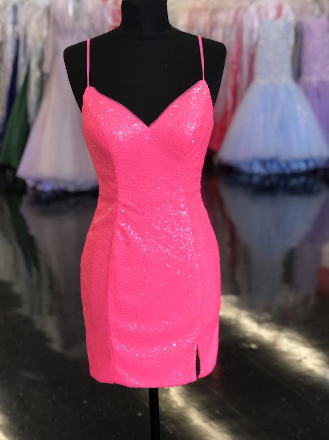 Dave & Johnny 10709 Size 2 Neon Pink Short Sequin Fitted Cocktail Homecoming Dress Slit V Neck Formal Gown