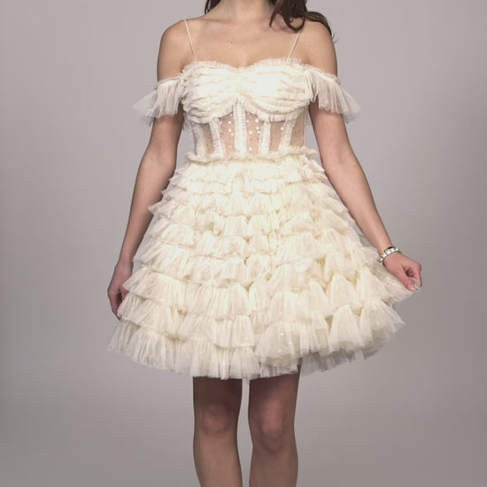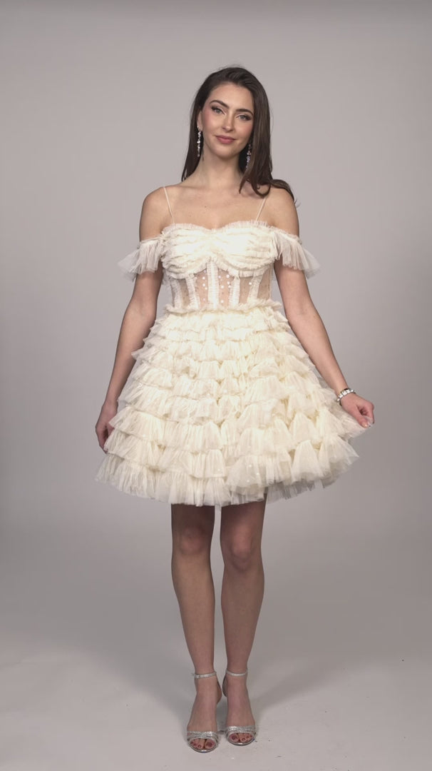 Discover the perfect combination of elegance and fun with the Dave & Johnny 11754 Homecoming Dress. This stunning design features a sheer corset off the shoulder top, adorned with shimmery sequin layer tulle. With its playful cupcake skirt, this dress is guaranteed to make you stand out at any event.