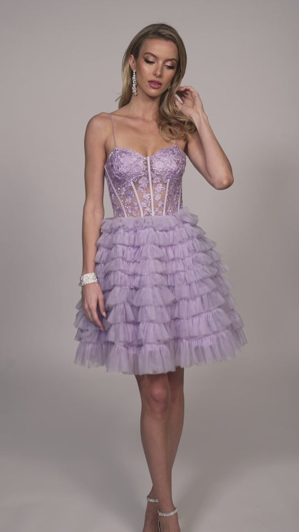 Dave & Johnny 11766 Layer Ruffle A Line Homecoming Dress Sheer Lace Corset Cocktail Gown