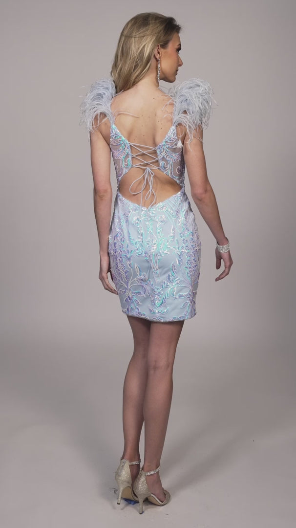 Dave & Johnny 11974 Short Fitted Sequin Feather Homecoming Dress Backless Corset Gown