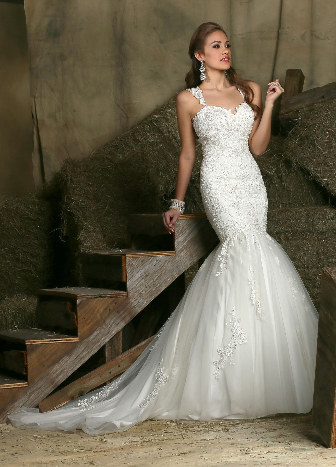 Davinci Bridal 50330 Lace & Tulle Mermaid Wedding Dress features a Fitted Beaded Lace Bodice with Sweetheart Neckline & Tapered Beaded Lace Straps. Low Scoop Back is Sheer Tulle with Lace Applique & Covered Buttons. Gathered Tulle Mermaid Skirt with Lace Applique Flares from the Knee into a Chapel Train. Trumpet skirt with train. Wedding dress - Bridal Gown - Immediate Delivery on In Stock Gowns! Fabric: Lace, Tulle, Neckline: Straps, Sweetheart, Silhouette: Fit And Flare, Mermaid, Sheath, Details: Beading, Buttons, Chapel Train, Lace, Lace Applique, Sequin Accent, Sheer Back, Zipper