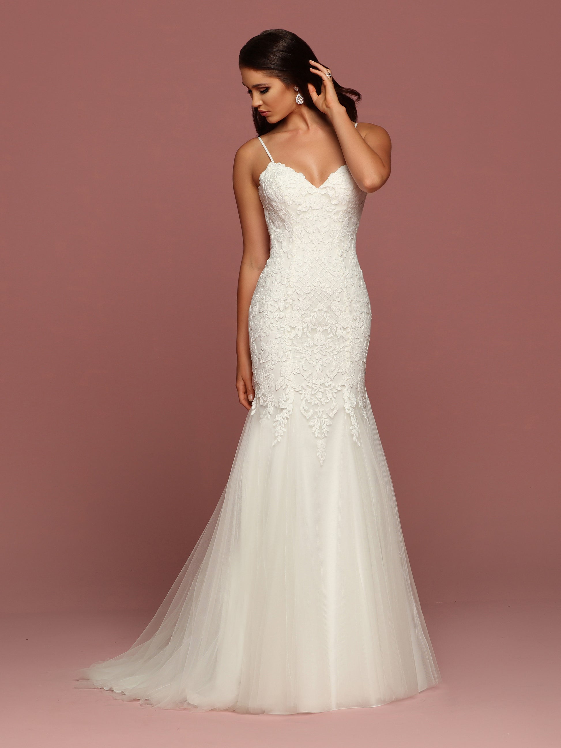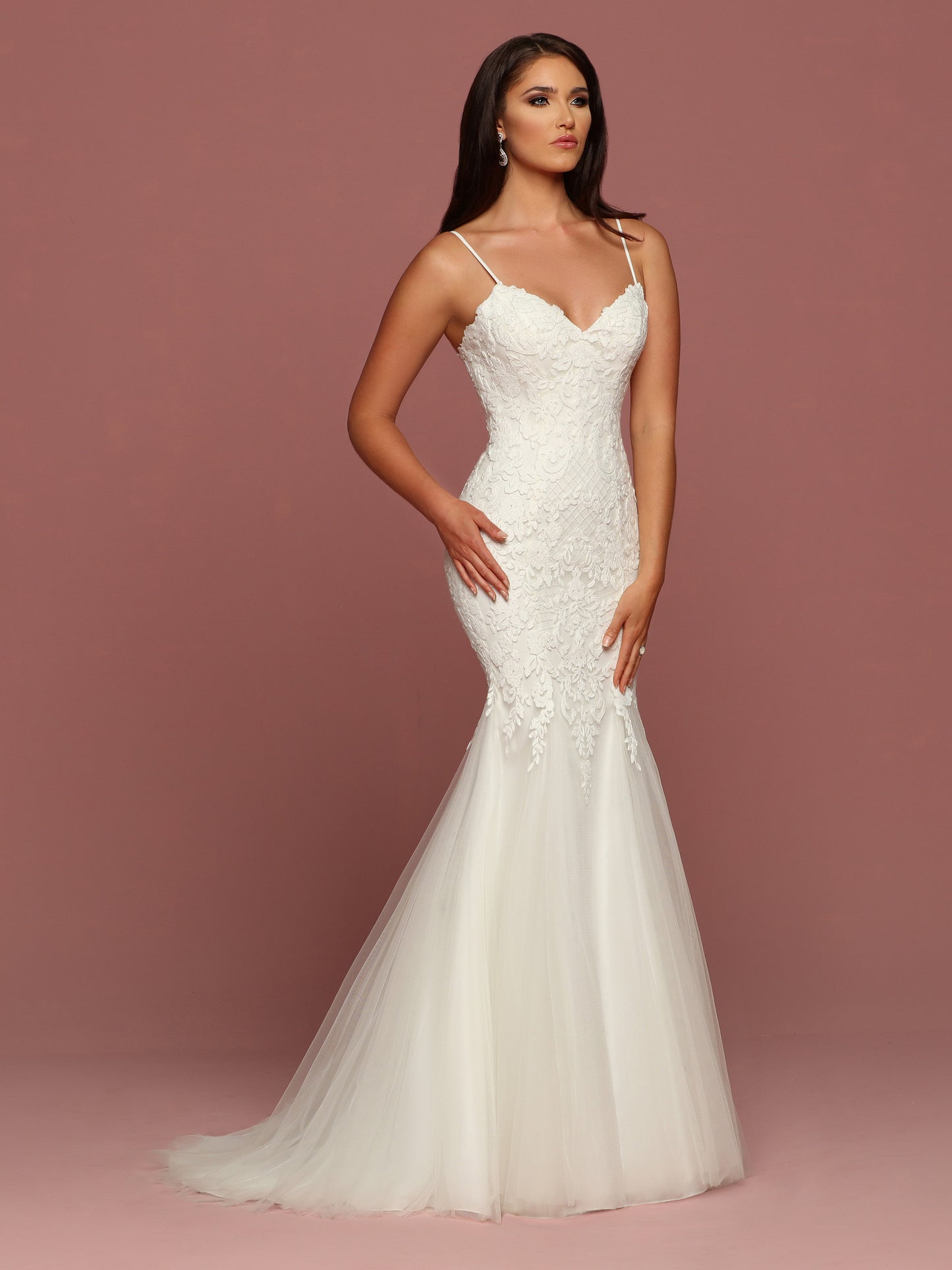 Davinci Bridal 50498 is a Fitted Mermaid Wedding dress. The bodice is adorned with lace that cascades into the tulle trumpet skirt. V Neck with spaghetti straps.