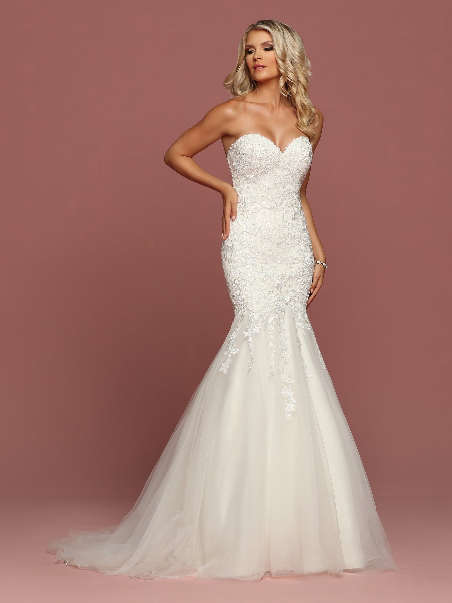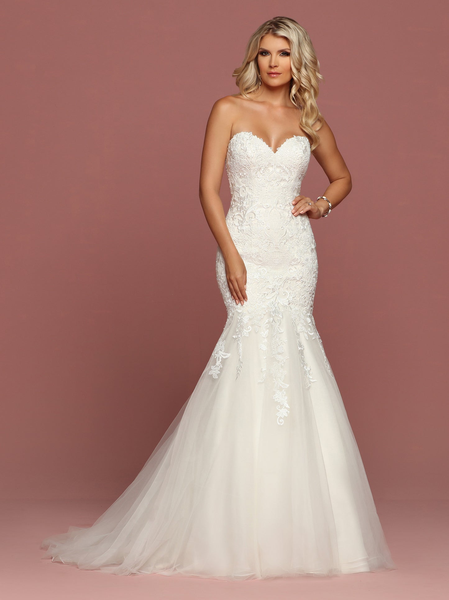 Davinci Bridal 50502 is a long Fit & Flare Mermaid Wedding Dress. Featuring a strapless sweetheart neckline with a bodice covered in delicate lace cascading down into the trumpet tulle skirt with a train in the back.