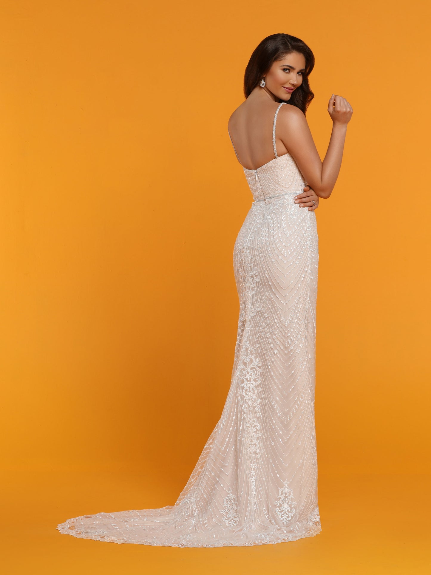 Davinci Bridal 50511 Tulle & Lace Fit & Flare Wedding Dress features a Floral Lace Bodice with V-Neckline, Sheer Lace Wideset Straps, Sheer Lace Back with Covered Buttons & Beaded Waistband. Scalloped Lace Fit & Flare Skirt finishes with a Chapel Train.