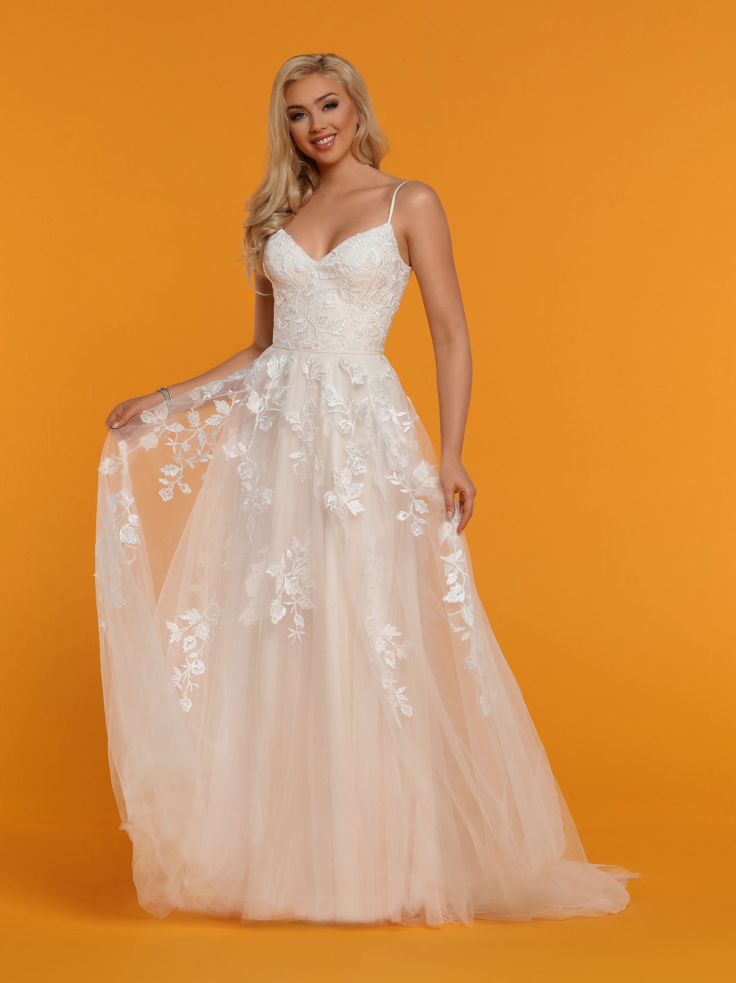 Davinci Bridal 50536 is a soft tulle A Line Wedding Dress Featuring Hand Embellished Lace Over Tulle. V Neckline with spaghetti straps and an open V Back. Long tulle train.