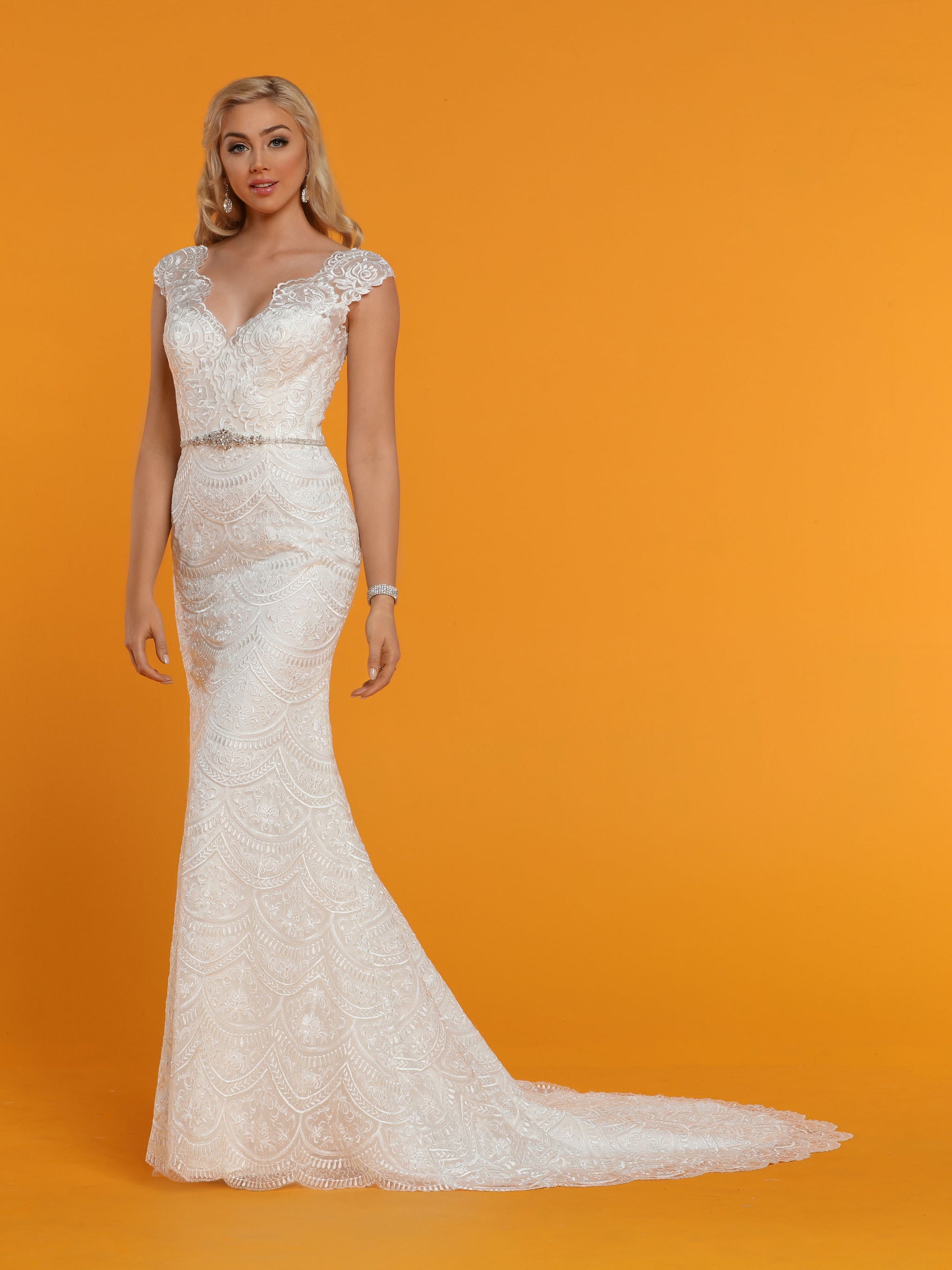 Davinci Bridal 50540 is a Long Fitted Mermaid Silhouette Wedding Dress. Featuring a Sweetheart illusion Sheer Lace V Neckline with sheer lace wide straps leading to a sheer lace Illusion Back. Detailed crystal bridal belt along the waistline. Eyelash lace edge along hem and train.