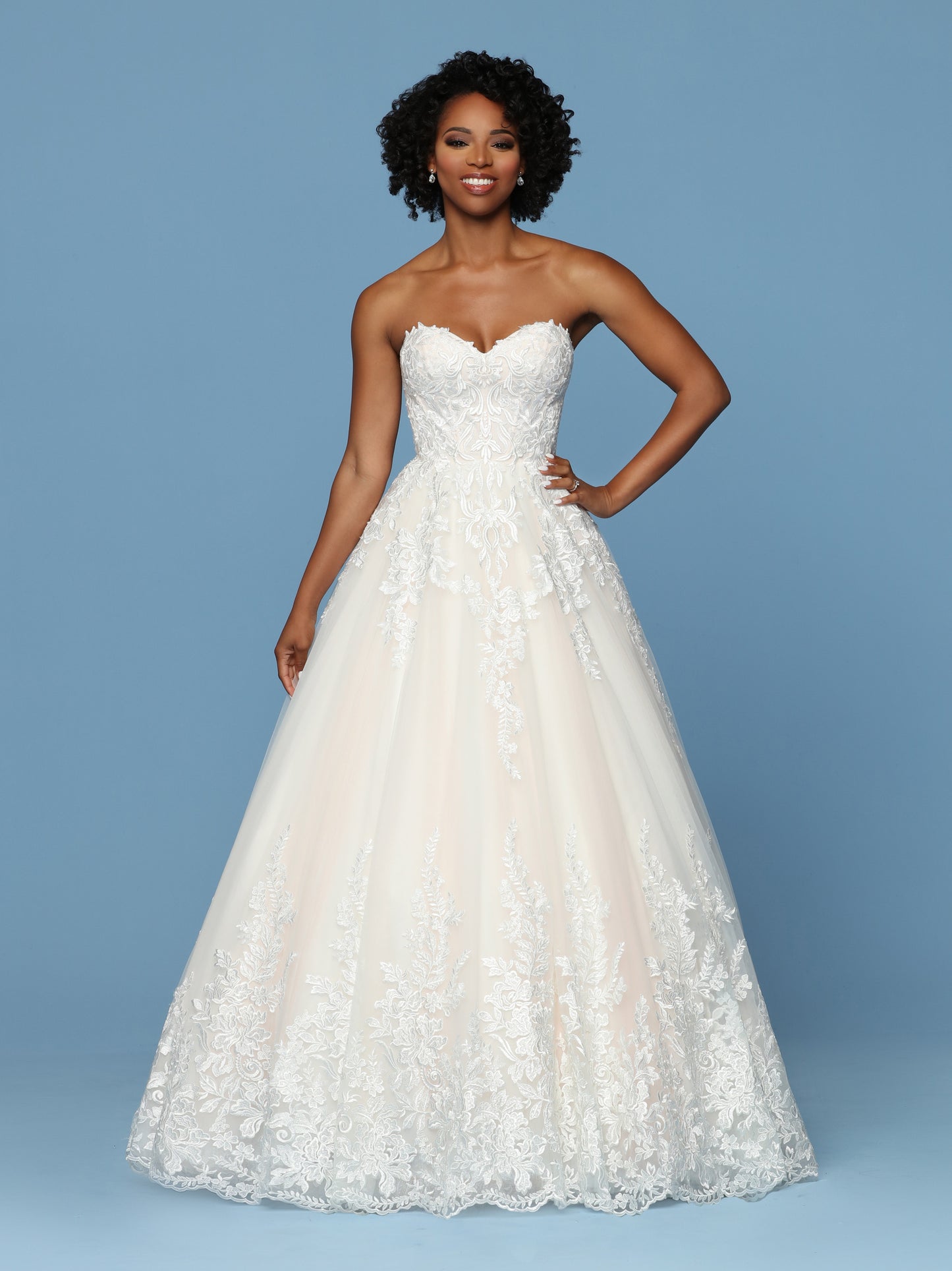 Davinci Bridal 50560 has a fitted strapless Sweetheart neckline with an embroidered lace bodice cascading into the tulle skirt. Full A Line Skirt Features a Lush Lace Edge around the hem and train.
