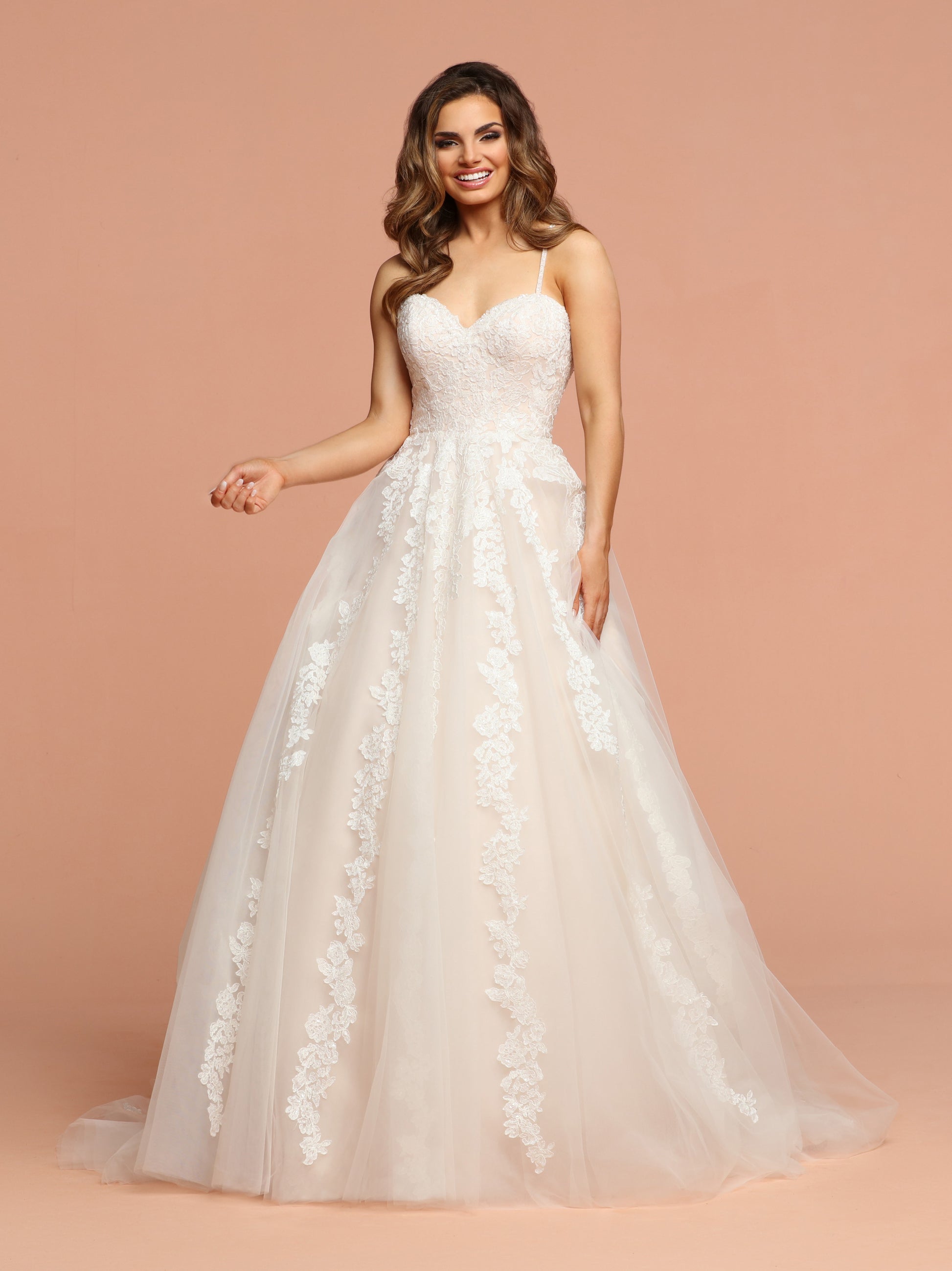 Davinci Bridal 50583 is a Full tulle Ballgown Wedding Dress with a train. Featuring a Strapless sweetheart lace bodice with lace cascading down into the skirt. Open Back with cross cross straps.
