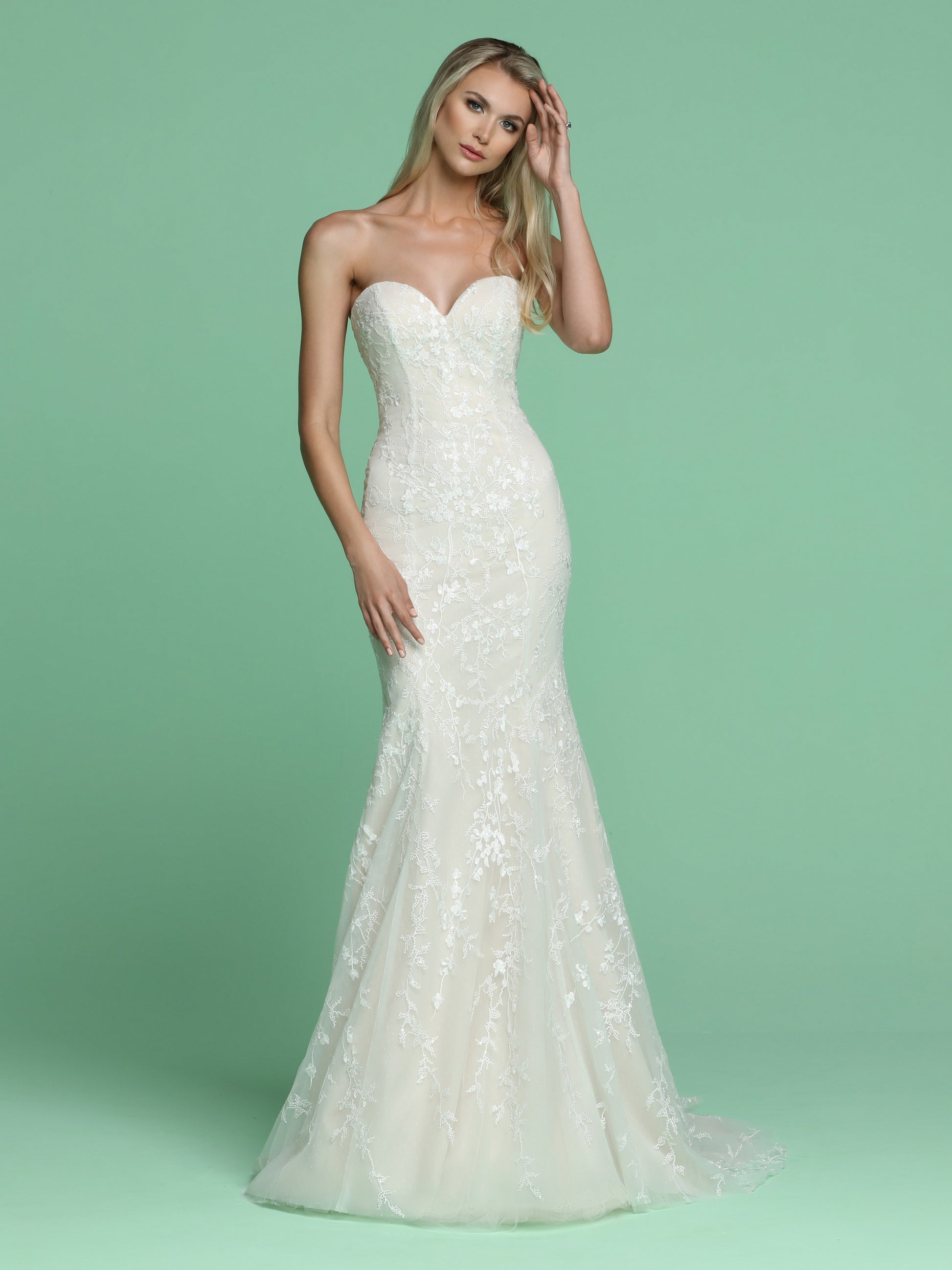 Davinci Bridal 50617 Long stunning Embroidered Tulle Fit & Flare wedding dress. Featuring a strapless sweetheart neckline with a sheer back. Buttons line the back of the gown. flowing into a sweeping train.