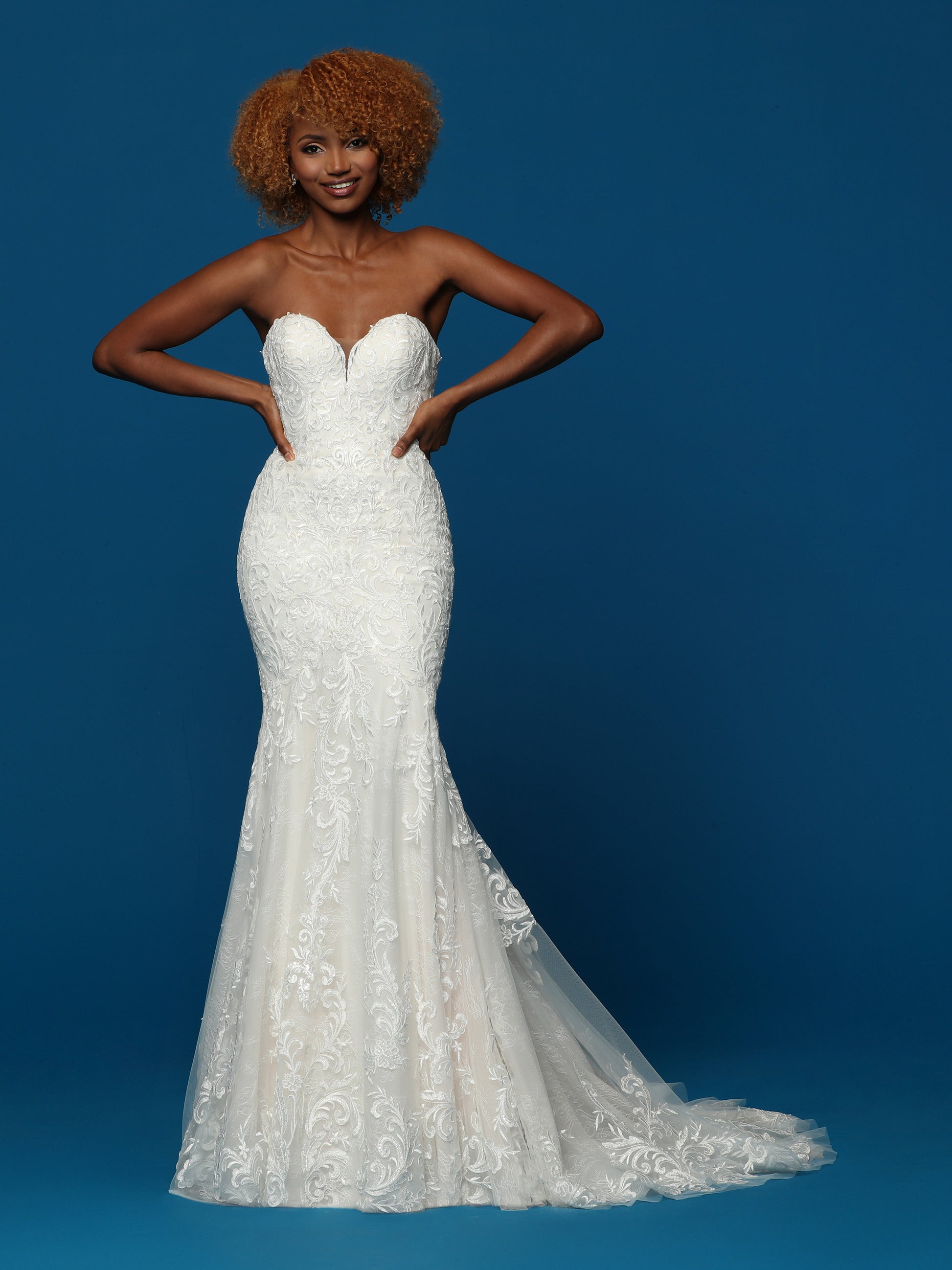 davinci Bridal 50642 Long Lace Fitted Mermaid Wedding Dress Strapless Sweetheart Train Beautiful Lace & Tulle Fit & Flare Sheath Wedding Dress has a Strapless Sweetheart Neckline & Corset Back & features a Lace Applique Bodice. The Delicate Tulle Lace Fit & Flare Skirt has a Sheer Overlay with Lace Applique Accents & Flares at the Back to a Full Chapel Length Train.