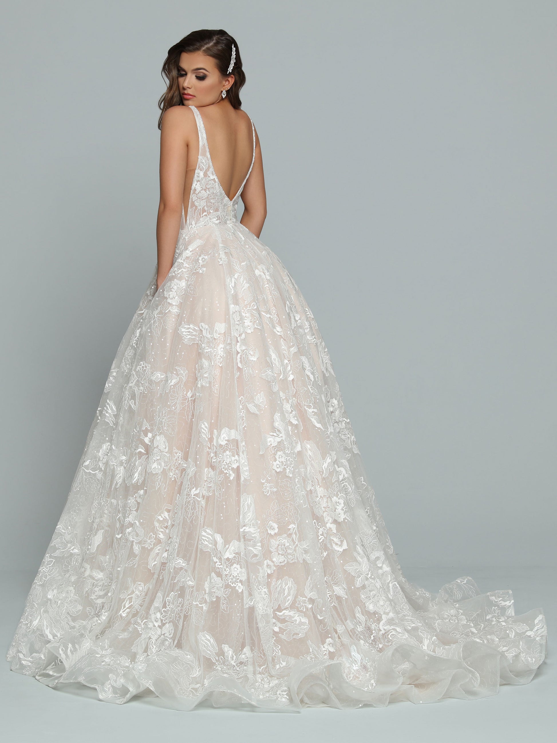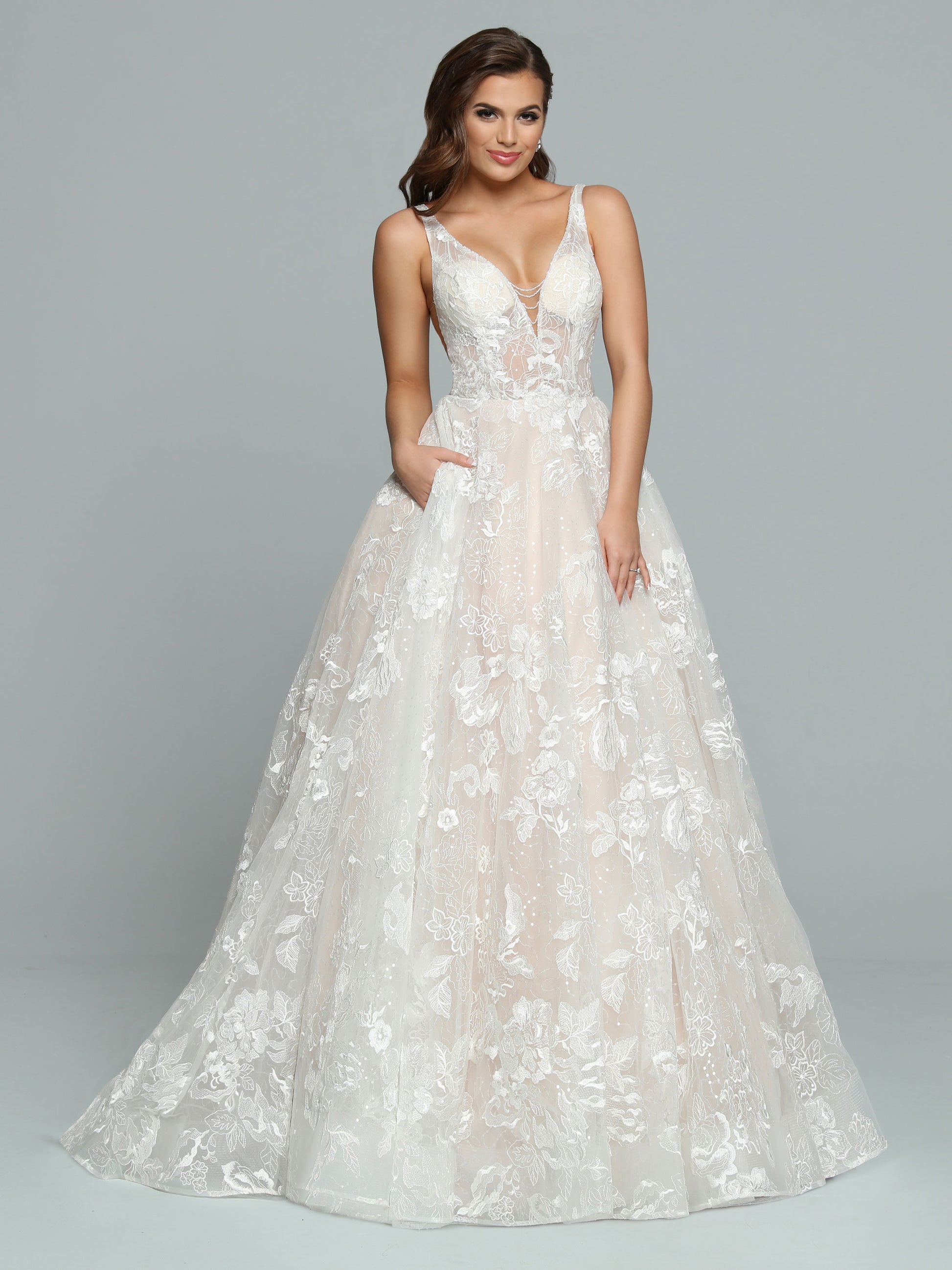 Davinci Bridal 50663 Long Shimmer Ballgown Wedding Dress Pockets V Neck Lace Gown Beautiful Embroidered Tulle A-Line Ball Gown Wedding Dress features a Deep V-Neckline with Modesty Panel & Beaded Accents The Neckline has Matching Beaded Edging. The Sheer Midriff has Sheer Side Panels to the Waist with Sheer Lace Straps framing the Deep V-Back. The Full Gathered Ball Gown Skirt has Hidden Pockets with a Bustle Style Back & Wavy Hem Chapel Train.