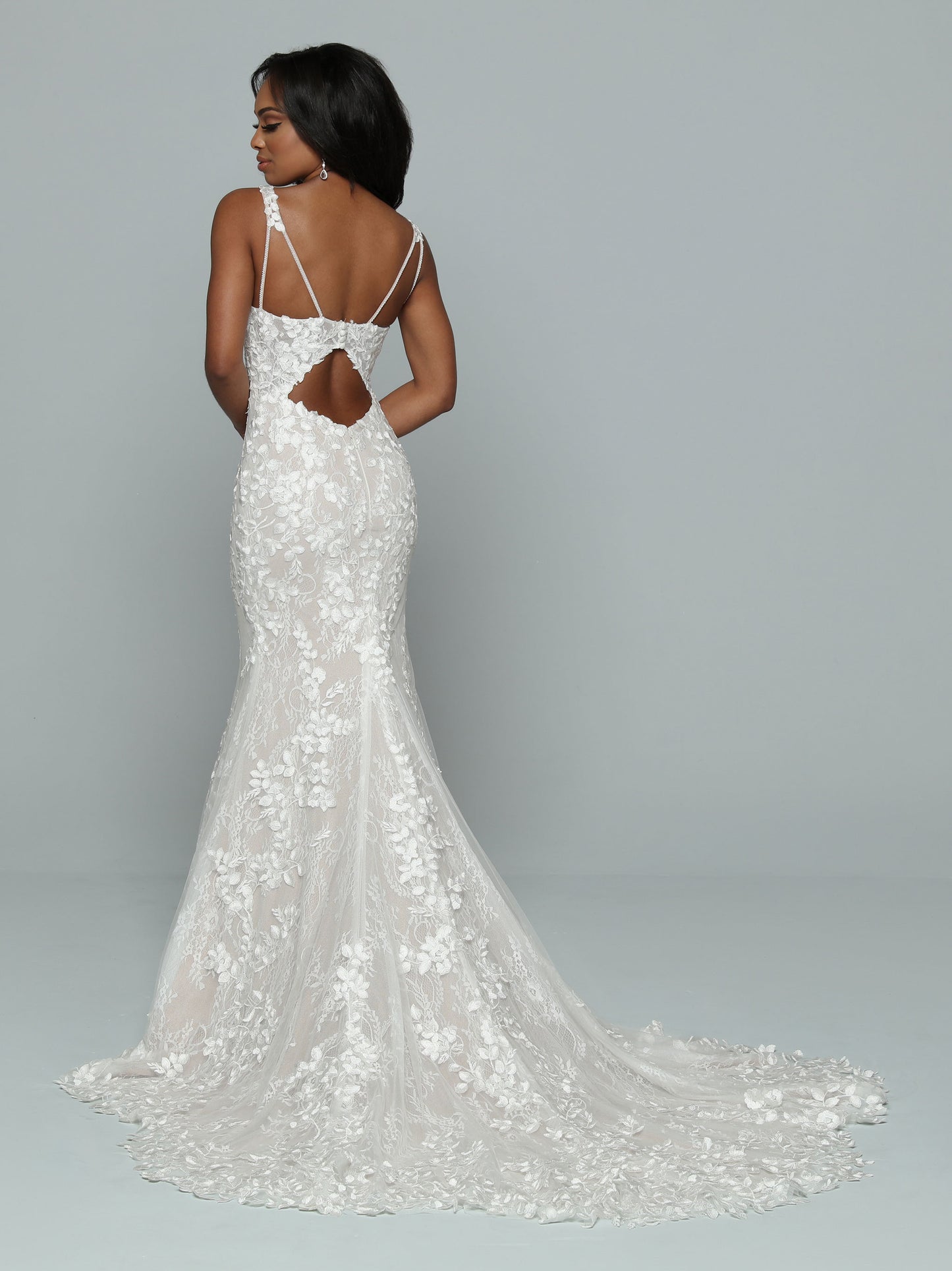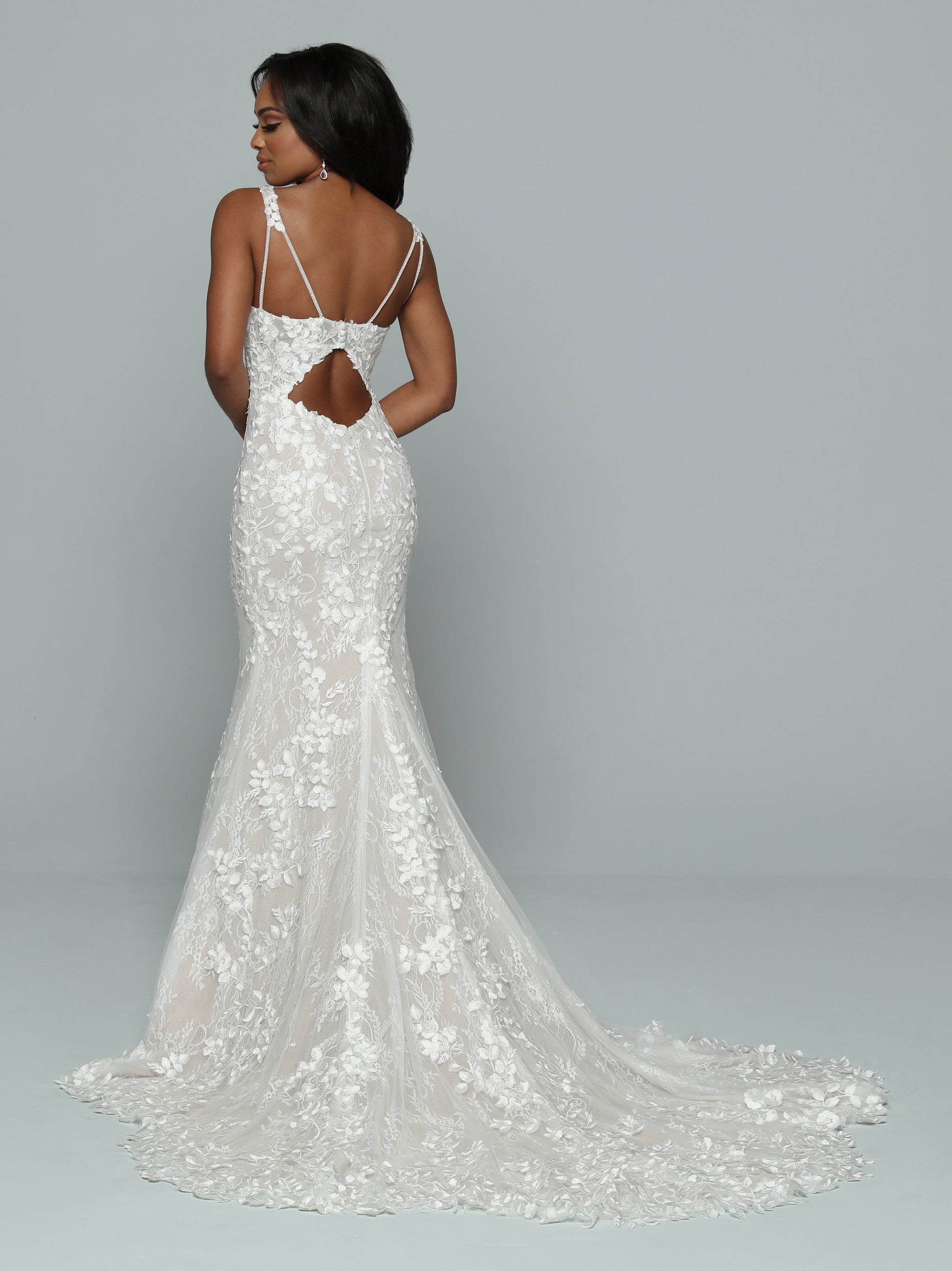 Davinci Bridal 50674 Long Fitted Lace Mermaid Wedding Dress Cut Out Back Bridal Gown Lace & Tulle Fit & Flare Sheath Wedding Dress features a Minimalist Silhouette with a Unique Strap Design. Double Spaghetti Straps Split at each Shoulder to create a One-of-a-Kind Triangle Design above a Low Back Keyhole. The Bodice with its Sweetheart Neckline has Allover Lace Applique that also Highlights the Skirt & Chapel Length Train.