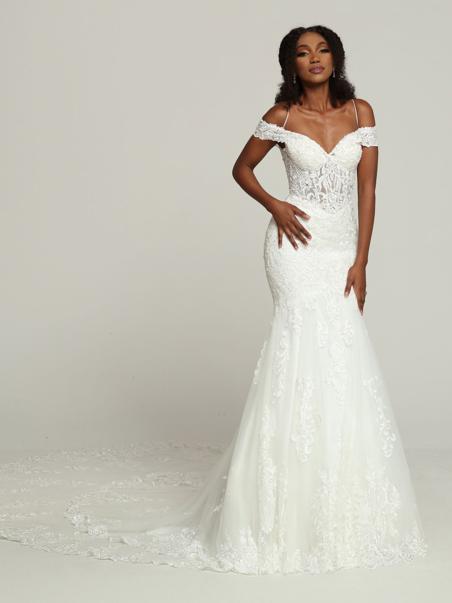 Davinci Bridal 50686 Sheer Beaded off the shoulder mermaid Wedding Dress Bridal Gown Train This Modern Lace & Tulle Fit & Flare Wedding Dress features a Sheer Beaded Lace Bodice with a Sweetheart Neckline, Off the Shoulder Straps & Slender Cold Shoulder Straps. Lace Applique Highlights the Dress to Below the Hip & Accents the Dramatic Mermaid-Style Skirt with its Double-Layer Chapel Train.