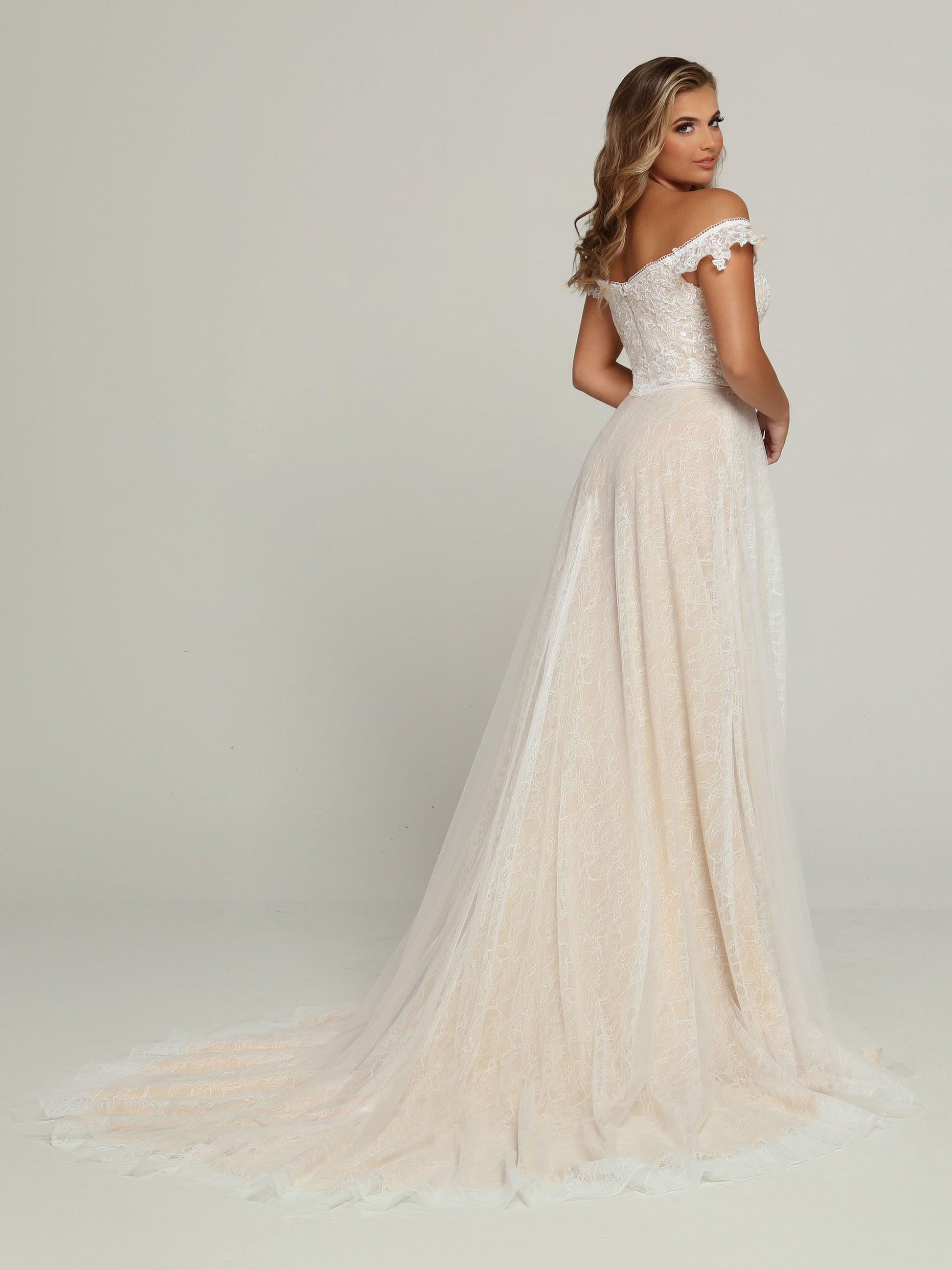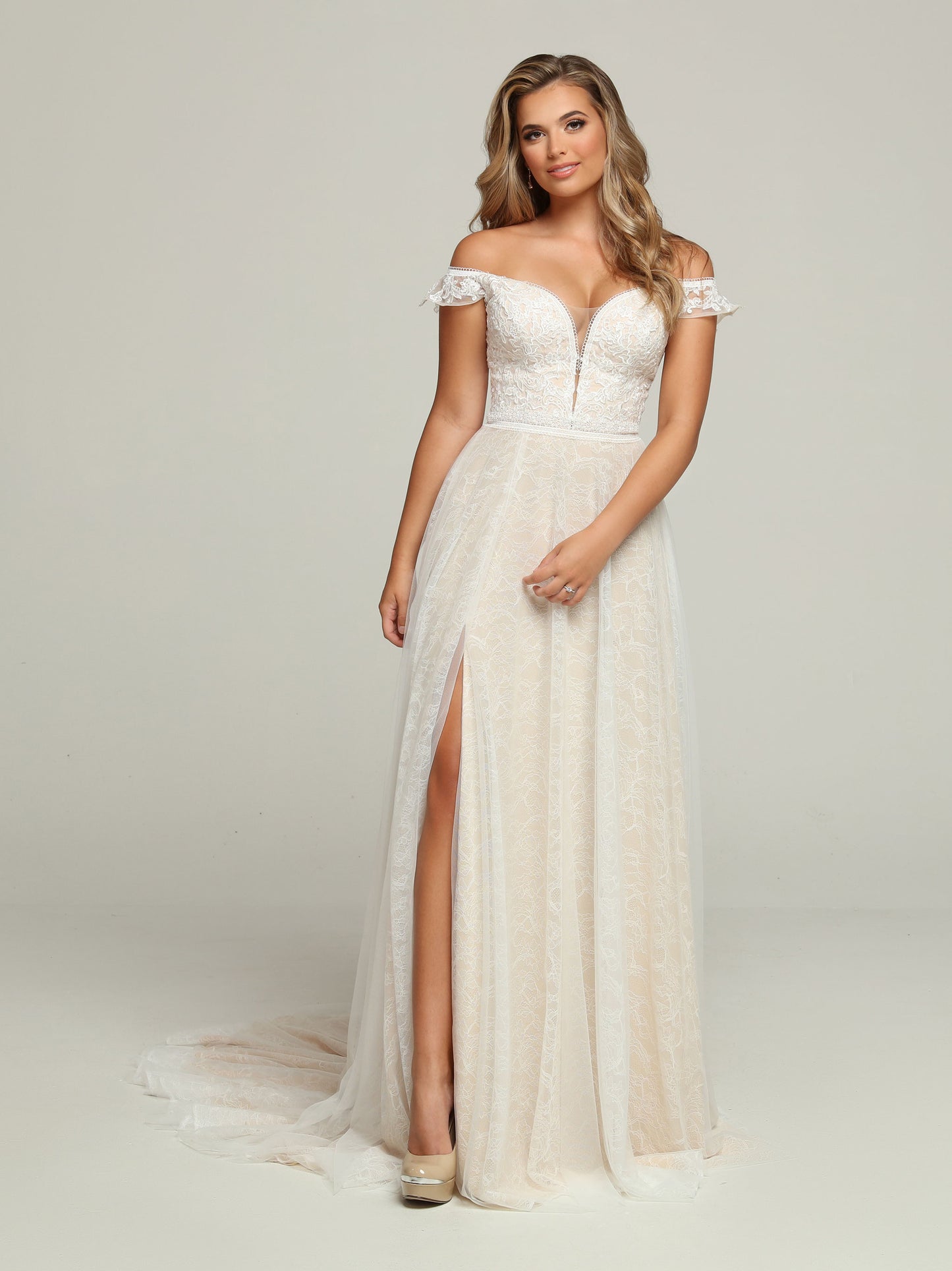 Davinci Bridal 50693 Long Lace A Line off the Shoulder Boho Wedding Dress Maxi Slit Bridal Gown Feminine & Alluring, this Lace A-Line Wedding Dress features a Plunging Sweetheart Neckline with Modesty Panel & Ruffled Off the Shoulder Straps. Lace Applique Accents the Bodice set off the Full Chapel Length Lace Skirt. A Thigh-High Slit finishes the look.